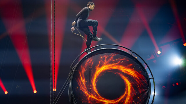 Ein absolutes Highlight des Abends: René Casselly wagt sich bei Flic Flac ins Todesrad. Hoch über der Manege läuft er auf der rotierenden Stahlkonstruktion, springt, balanciert – ohne Sicherung. Die Spannung im Zelt ist greifbar.