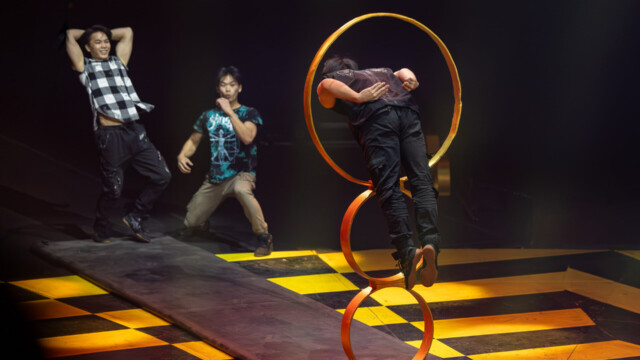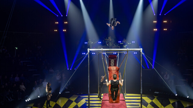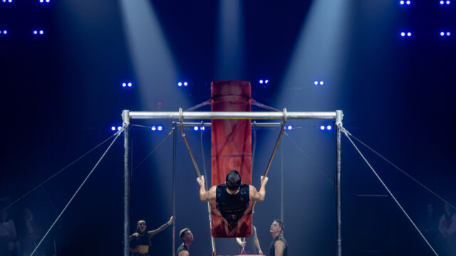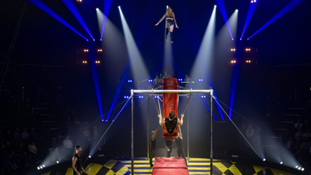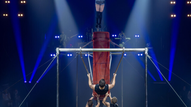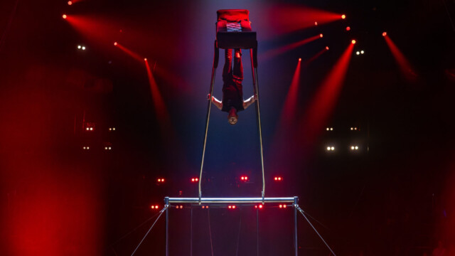 Die Ukrain Didyk Group präsentiert eine dynamische Schaukelnummer, bei der mehrere Akrobaten mit hoher Geschwindigkeit durch den Luftraum der Manege wechseln. Präzise Absprünge, exakte Flugbahnen und sichere Fänge bestimmen diese Darbietung, die durch ihre klare Struktur und ihr hohes Tempo überzeugt.