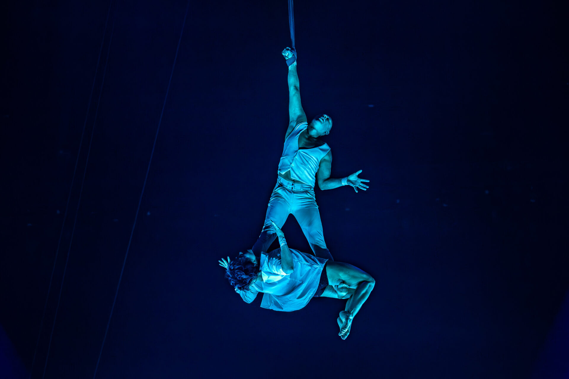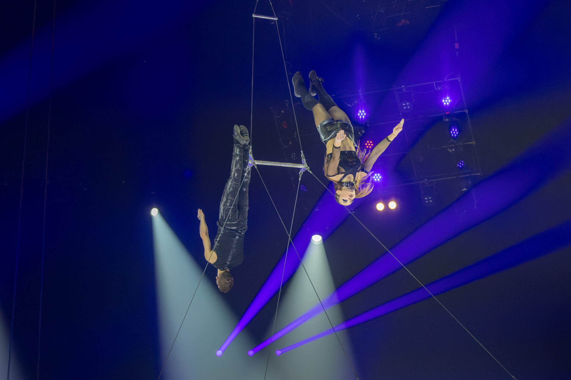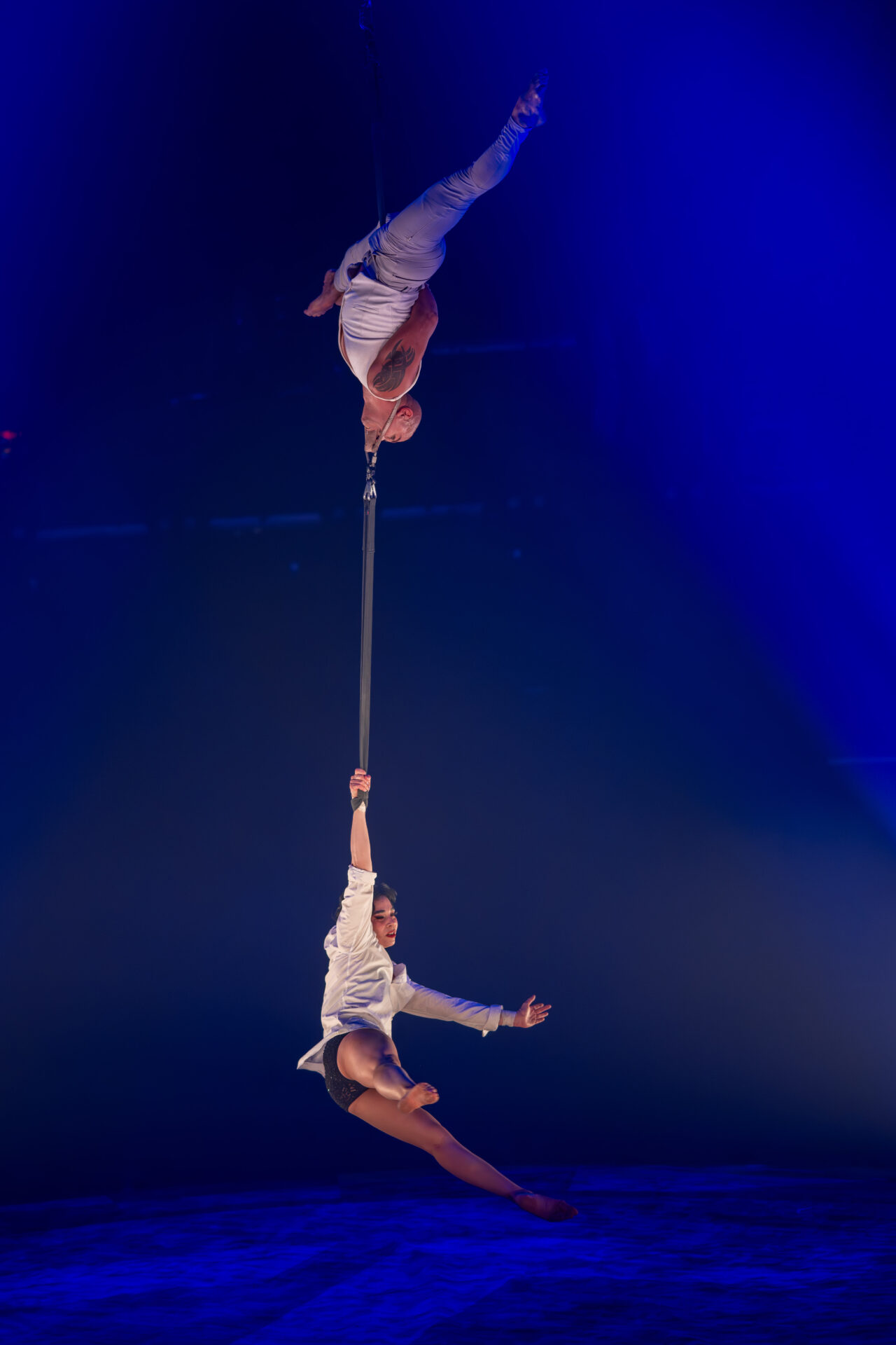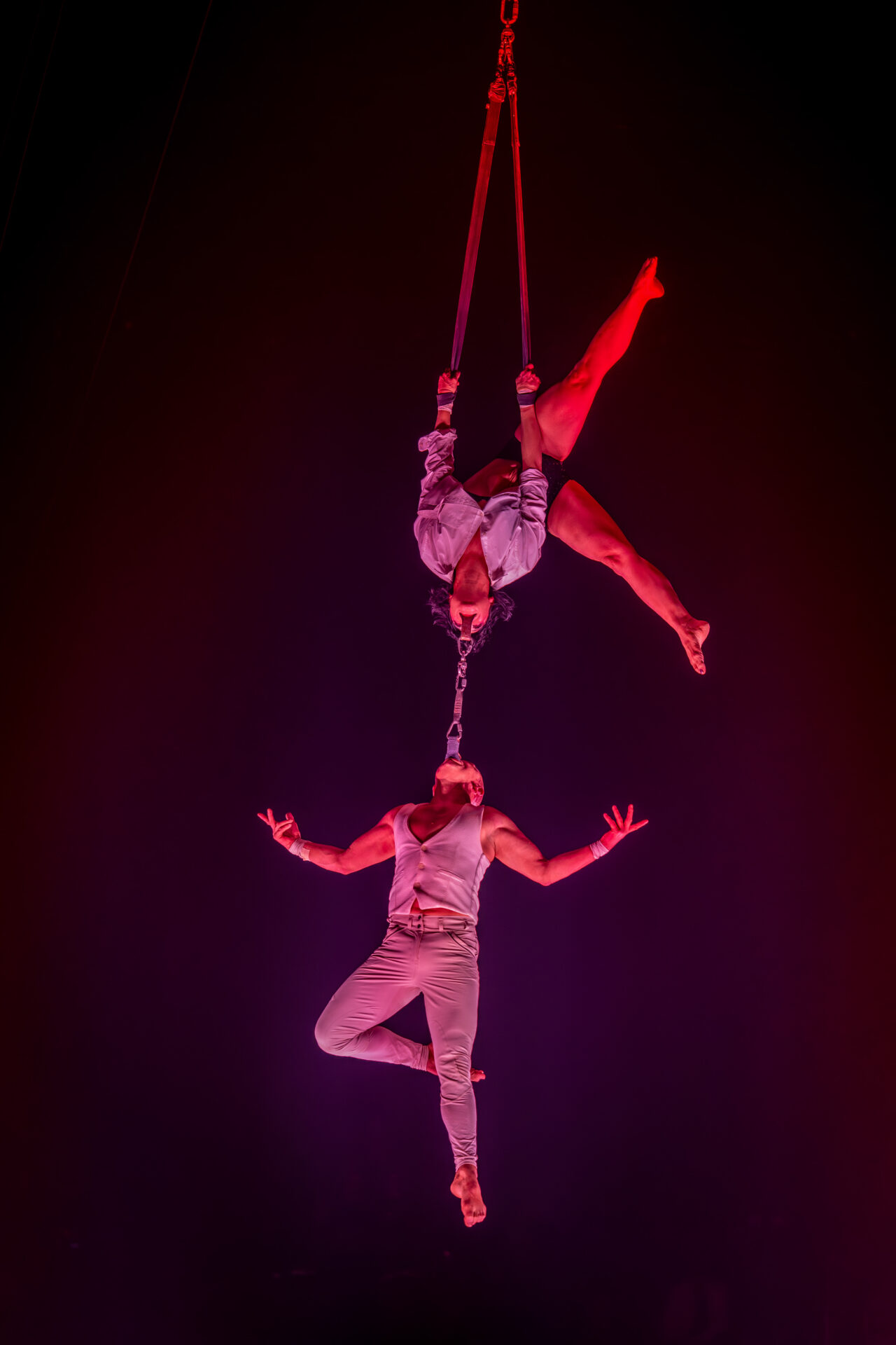 Mit dem Duo Requiem verlagert sich der Fokus auf Kraft, Kontrolle und Körperspannung. In ihrer Strapaten-Nummer setzen die beiden Artisten auf saubere Linien, kontrollierte Übergänge und eine ruhige Dramaturgie. Die reduzierte Inszenierung unterstreicht dabei die technische Qualität der Darbietung.