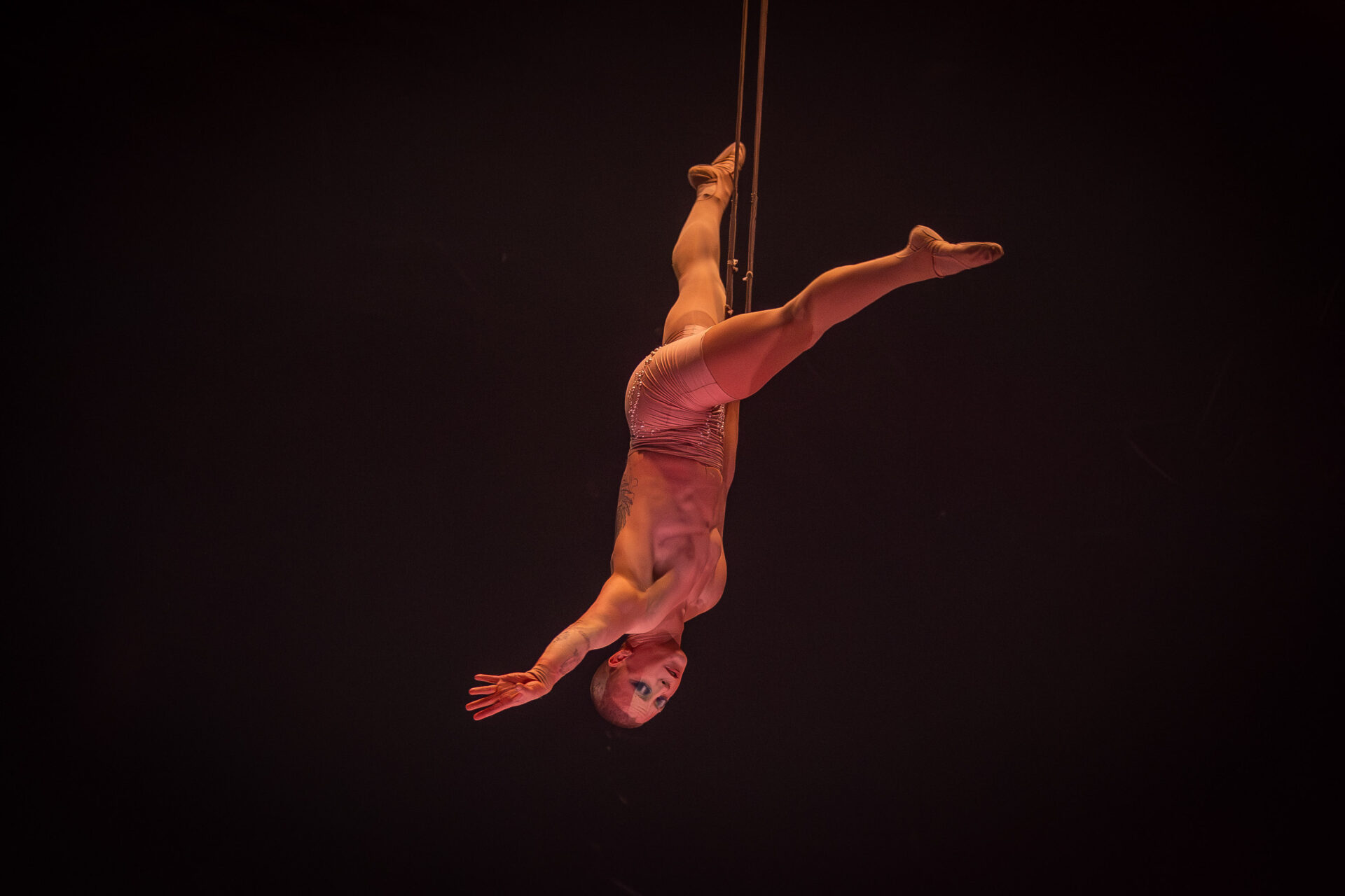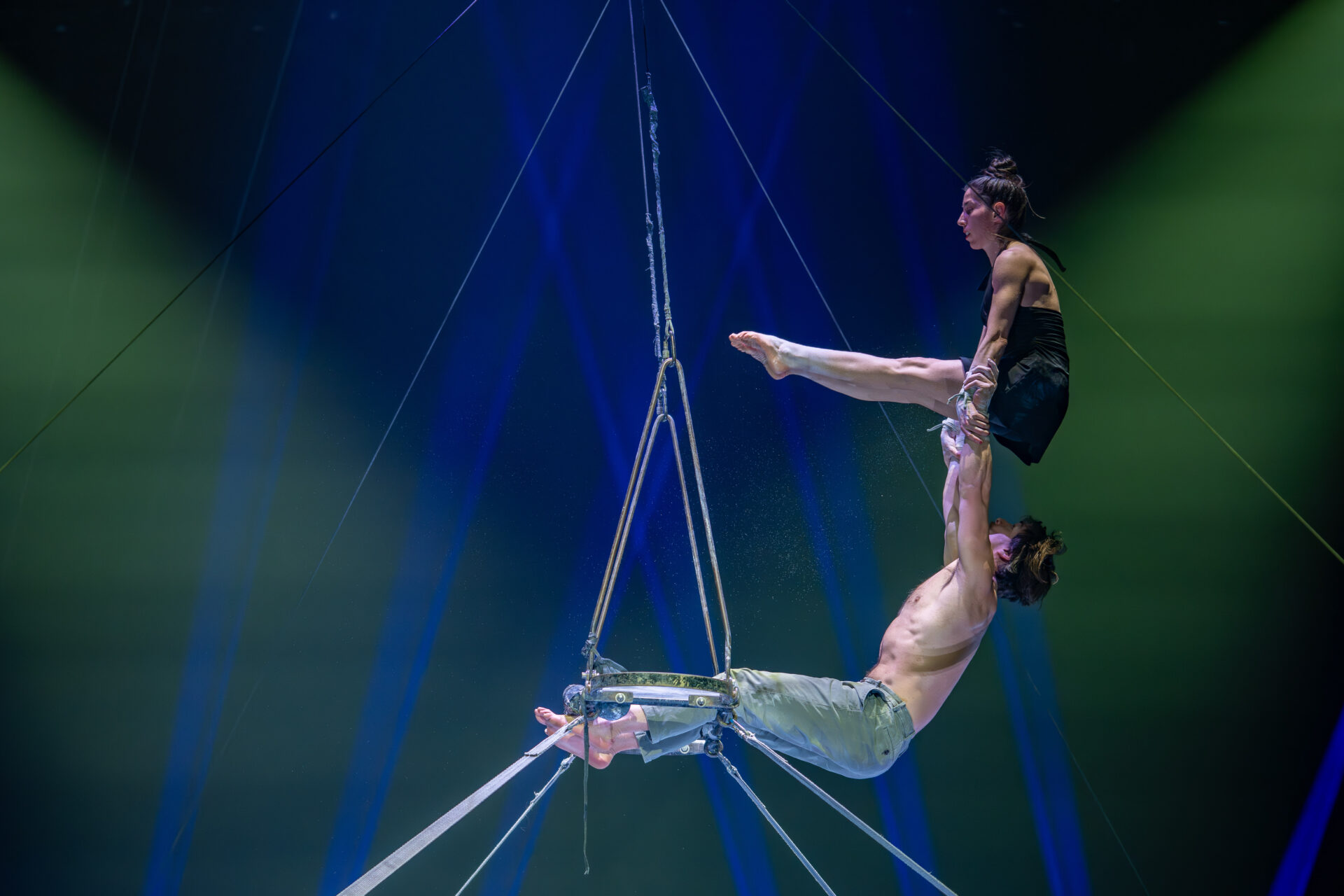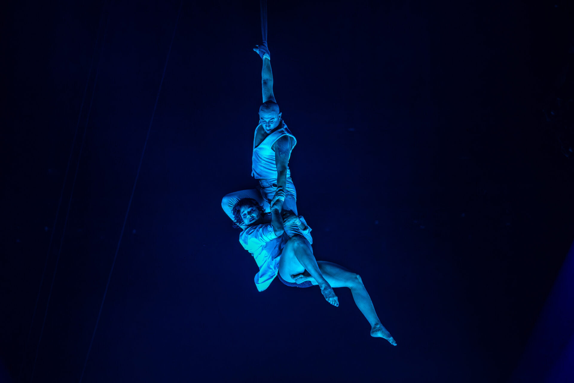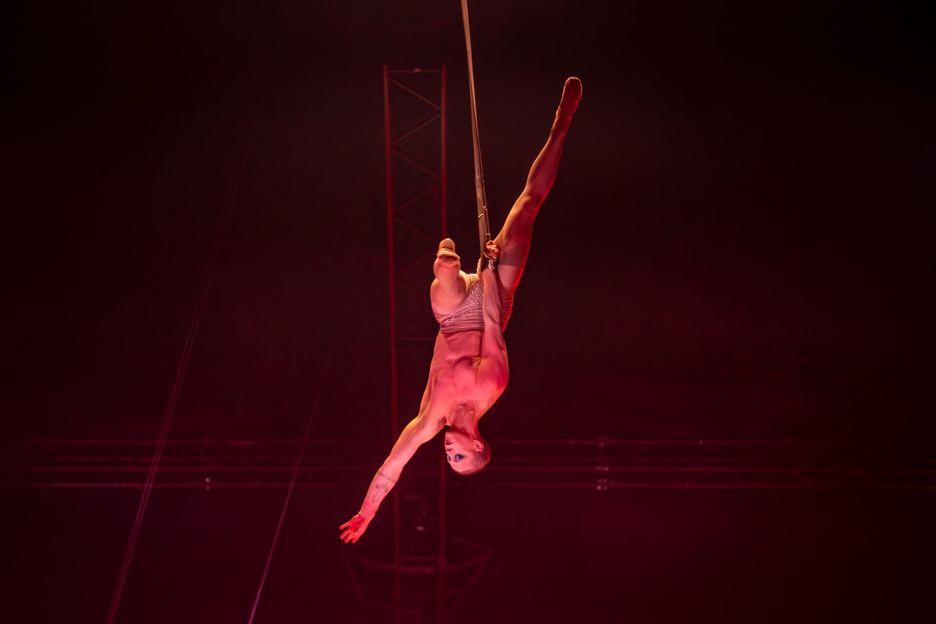 Mit dem Duo Requiem verlagert sich der Fokus auf Kraft, Kontrolle und Körperspannung. In ihrer Strapaten-Nummer setzen die beiden Artisten auf saubere Linien, kontrollierte Übergänge und eine ruhige Dramaturgie. Die reduzierte Inszenierung unterstreicht dabei die technische Qualität der Darbietung.