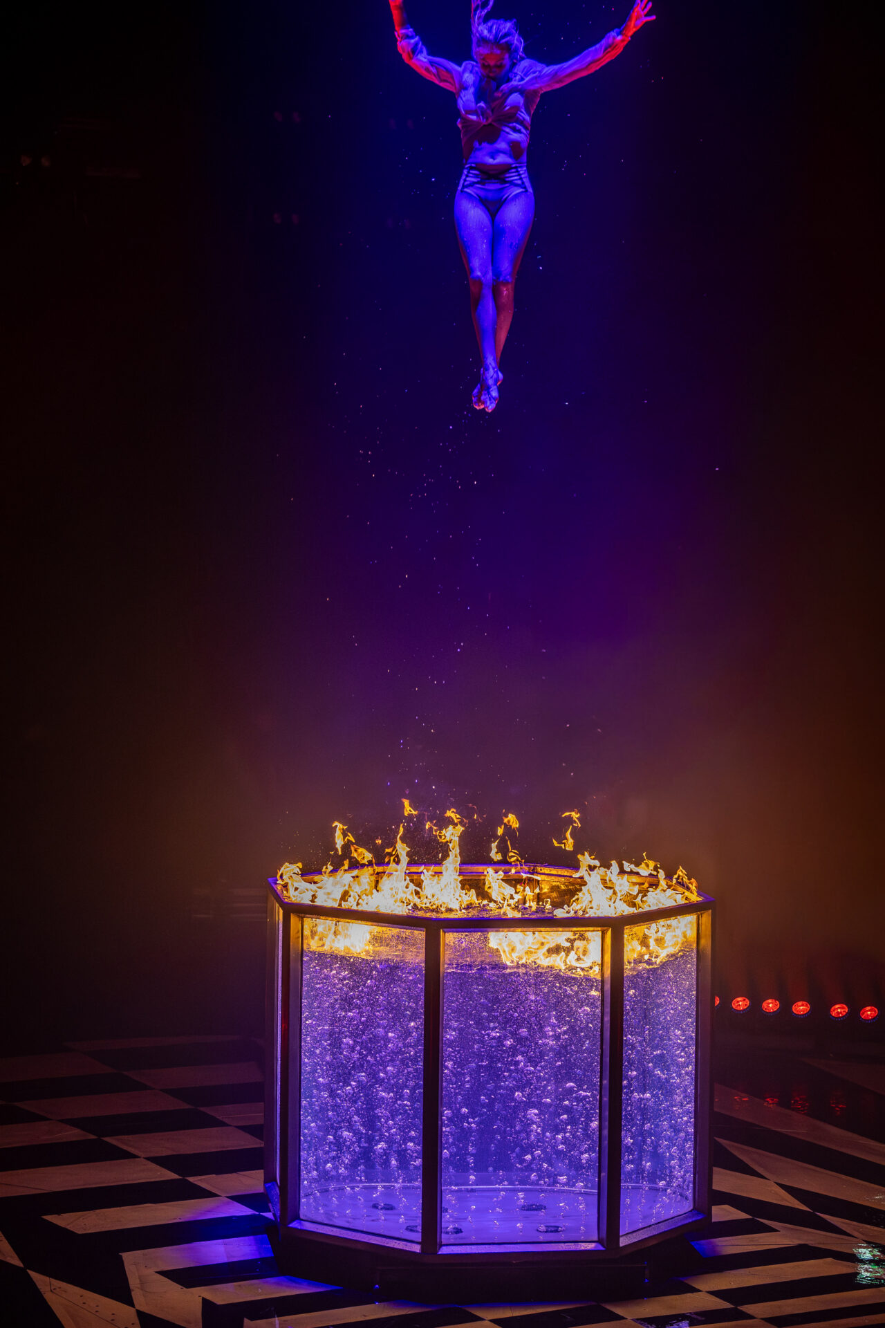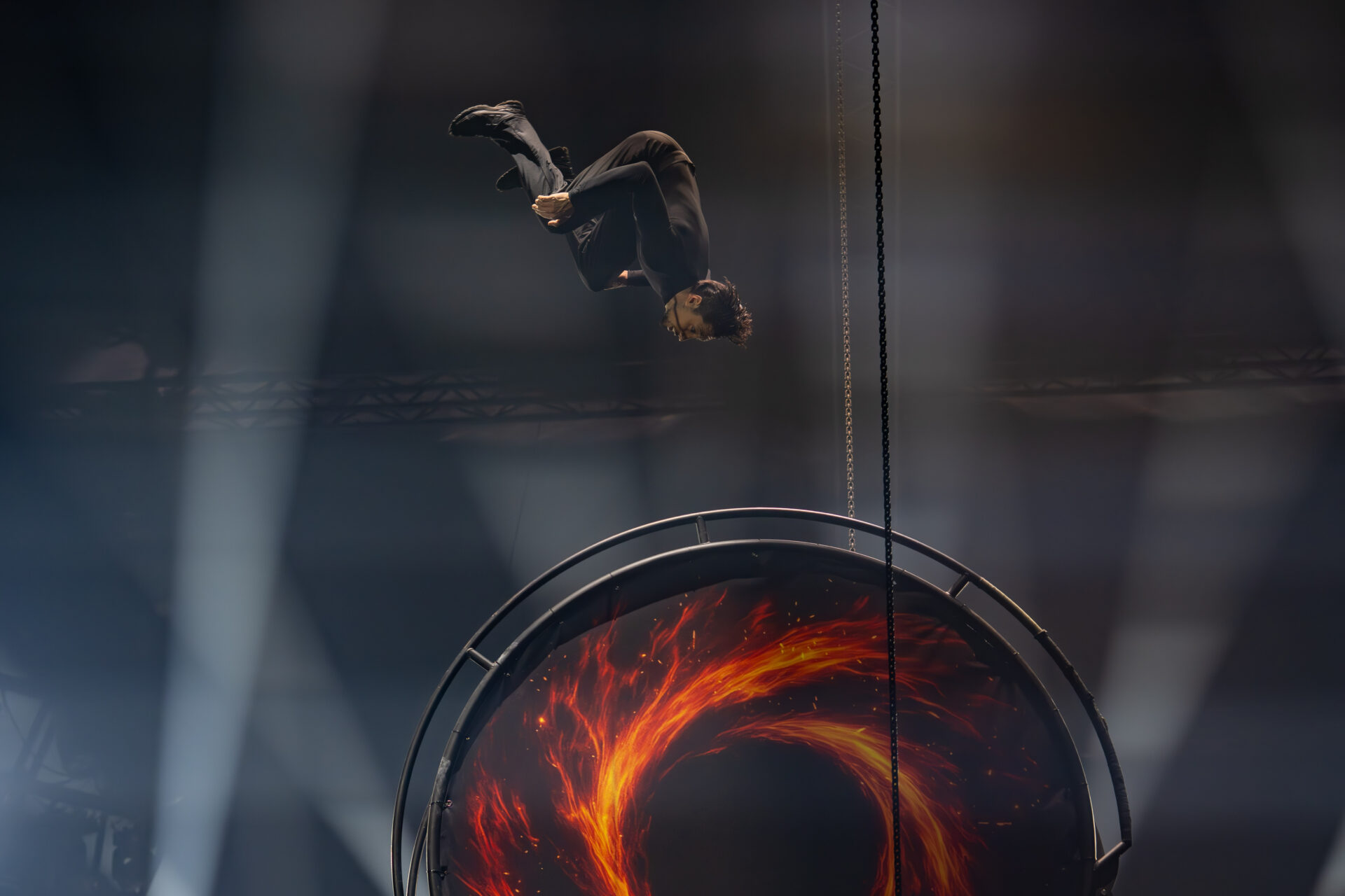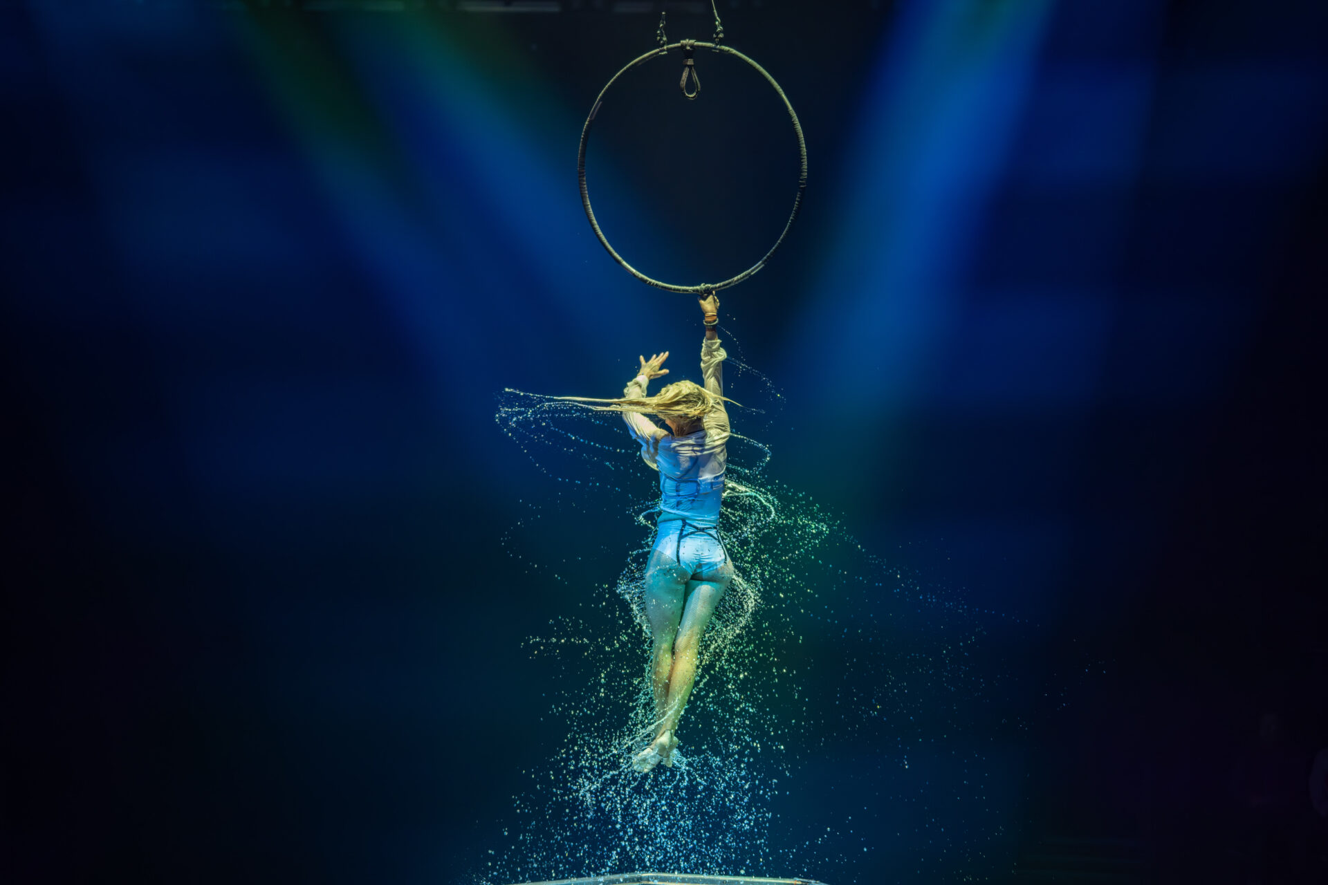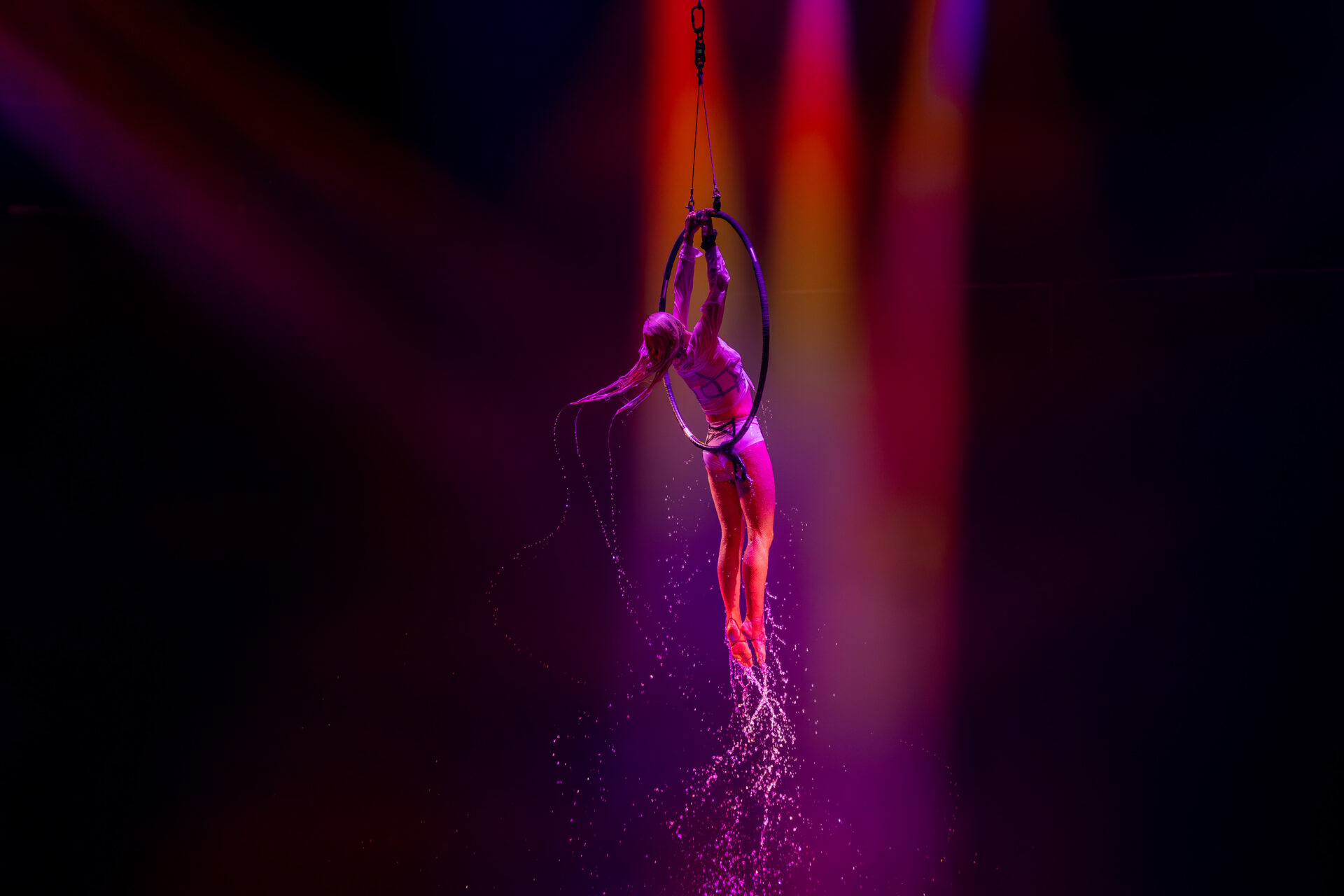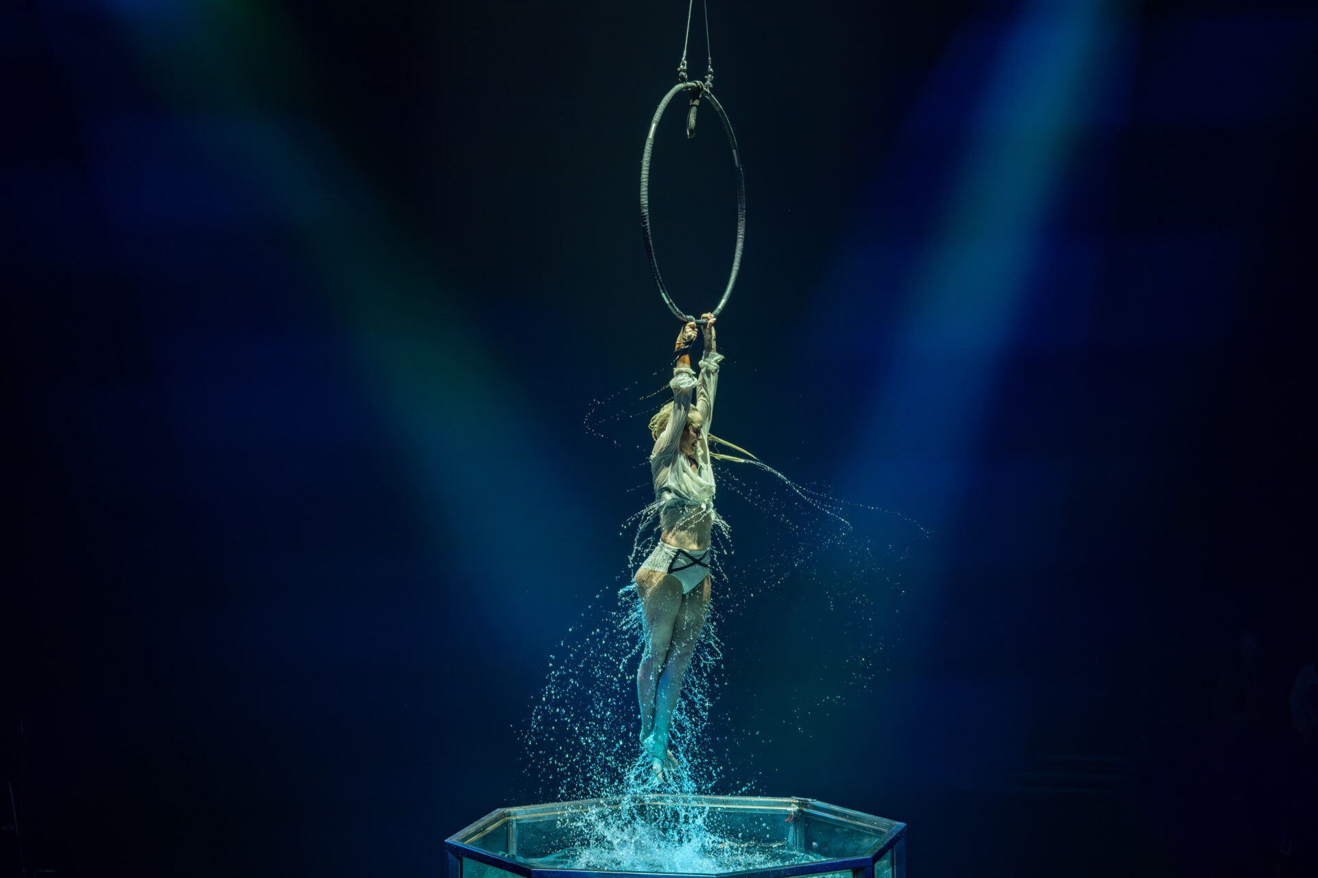 Einen atmosphärischen Akzent setzt Laura Miller. Wenn sie aus dem gläsernen Bassin mit ihrem Luftring in die Höhe schießt, entsteht ein kraftvolles Zusammenspiel aus Licht, Höhe und Bewegung. Die Nummer bleibt durchgehend dynamisch, steigert kontinuierlich Spannung und Tempo und fügt sich nahtlos in das Gesamtbild der Show ein.