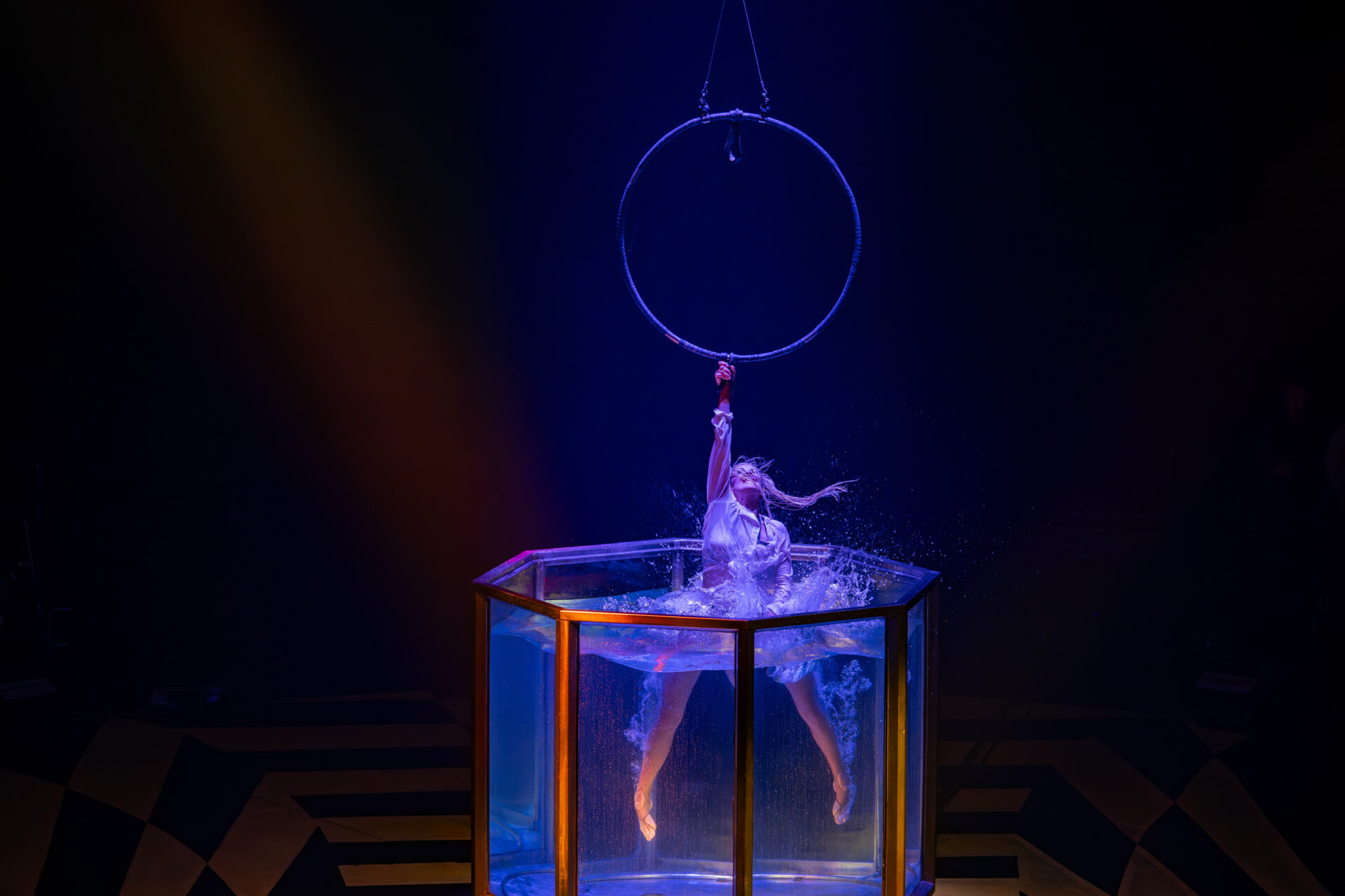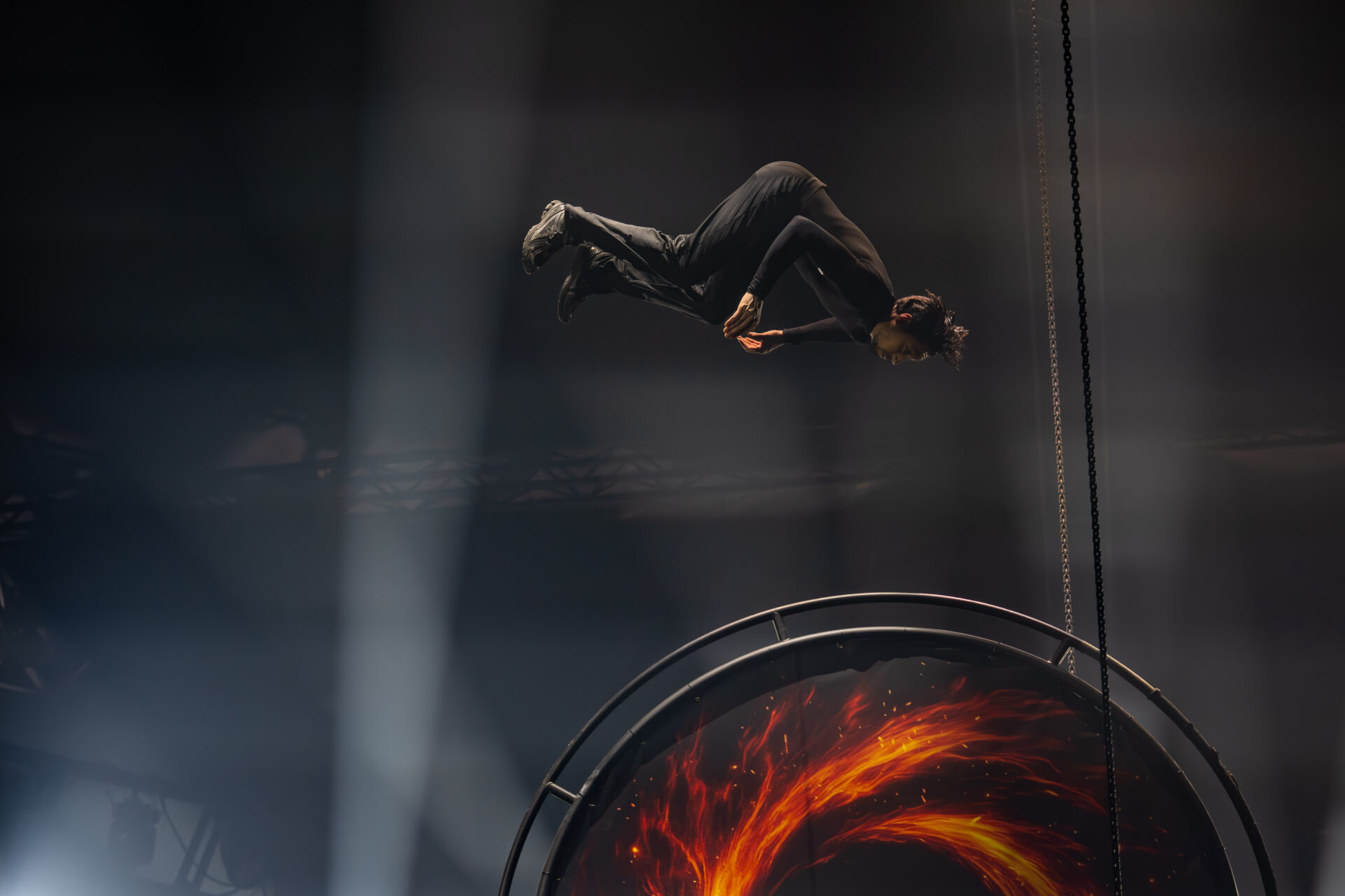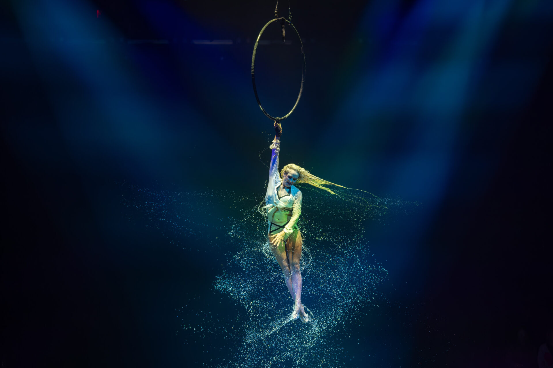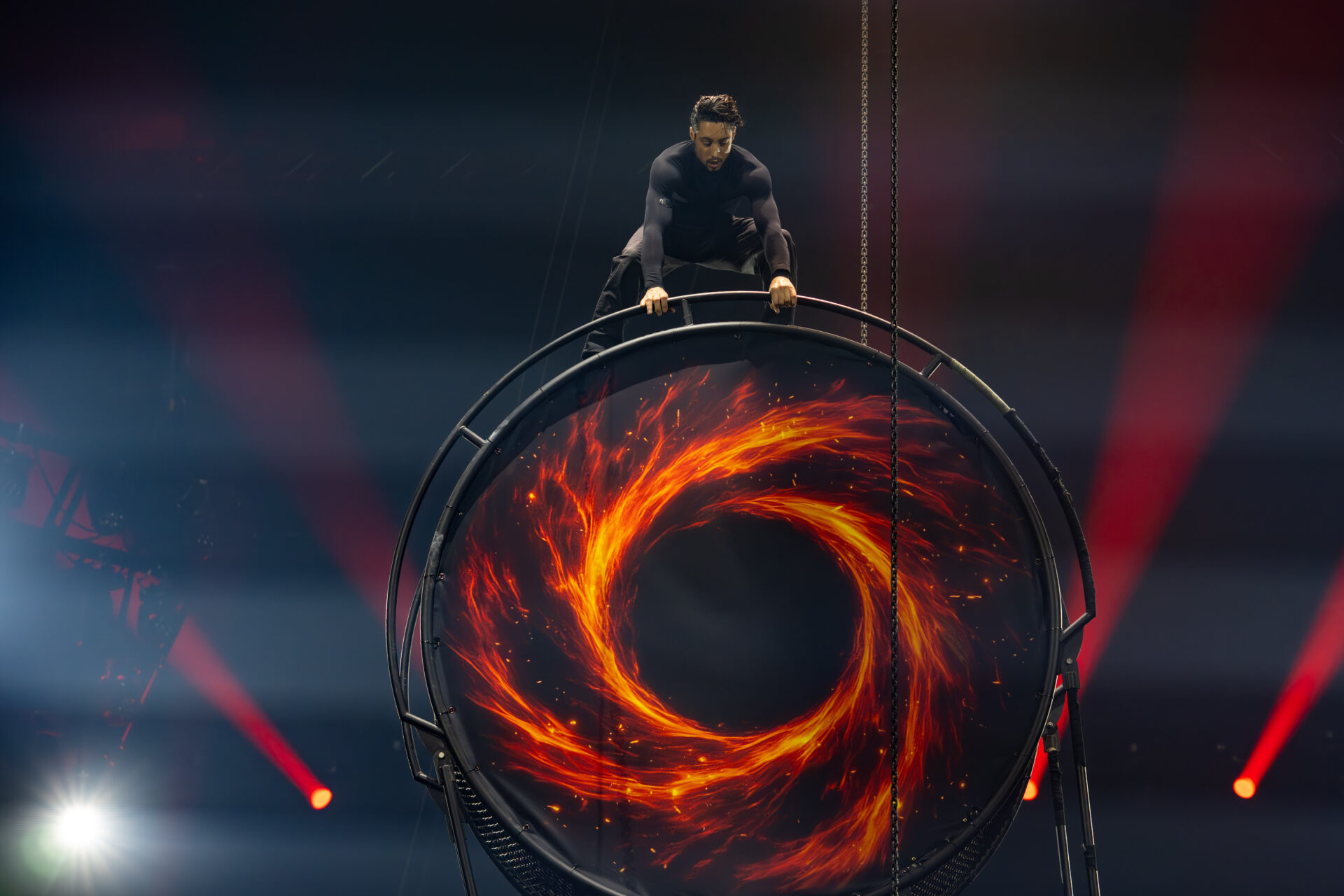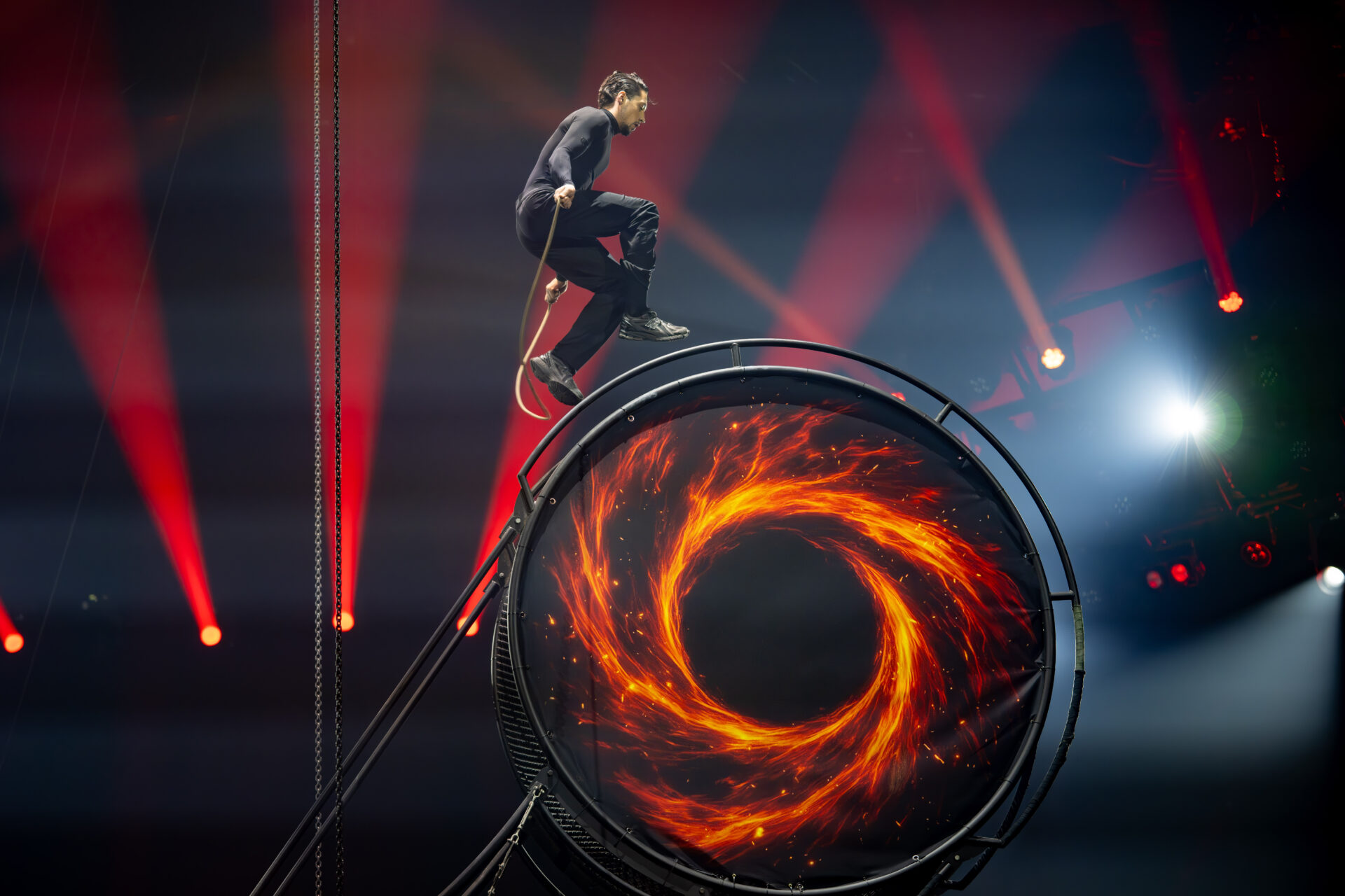 Einen atmosphärischen Akzent setzt Laura Miller. Wenn sie aus dem gläsernen Bassin mit ihrem Luftring in die Höhe schießt, entsteht ein kraftvolles Zusammenspiel aus Licht, Höhe und Bewegung. Die Nummer bleibt durchgehend dynamisch, steigert kontinuierlich Spannung und Tempo und fügt sich nahtlos in das Gesamtbild der Show ein.