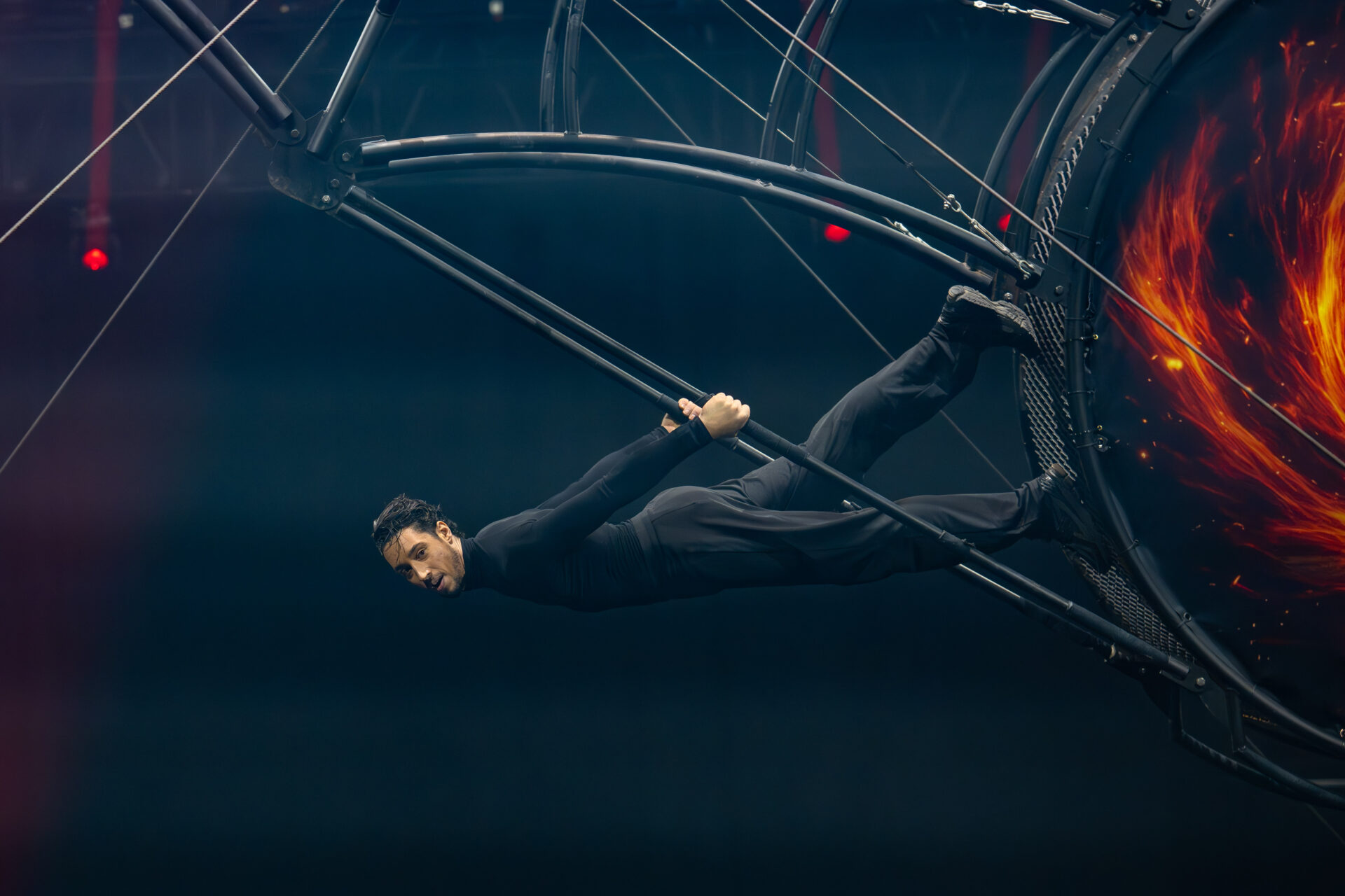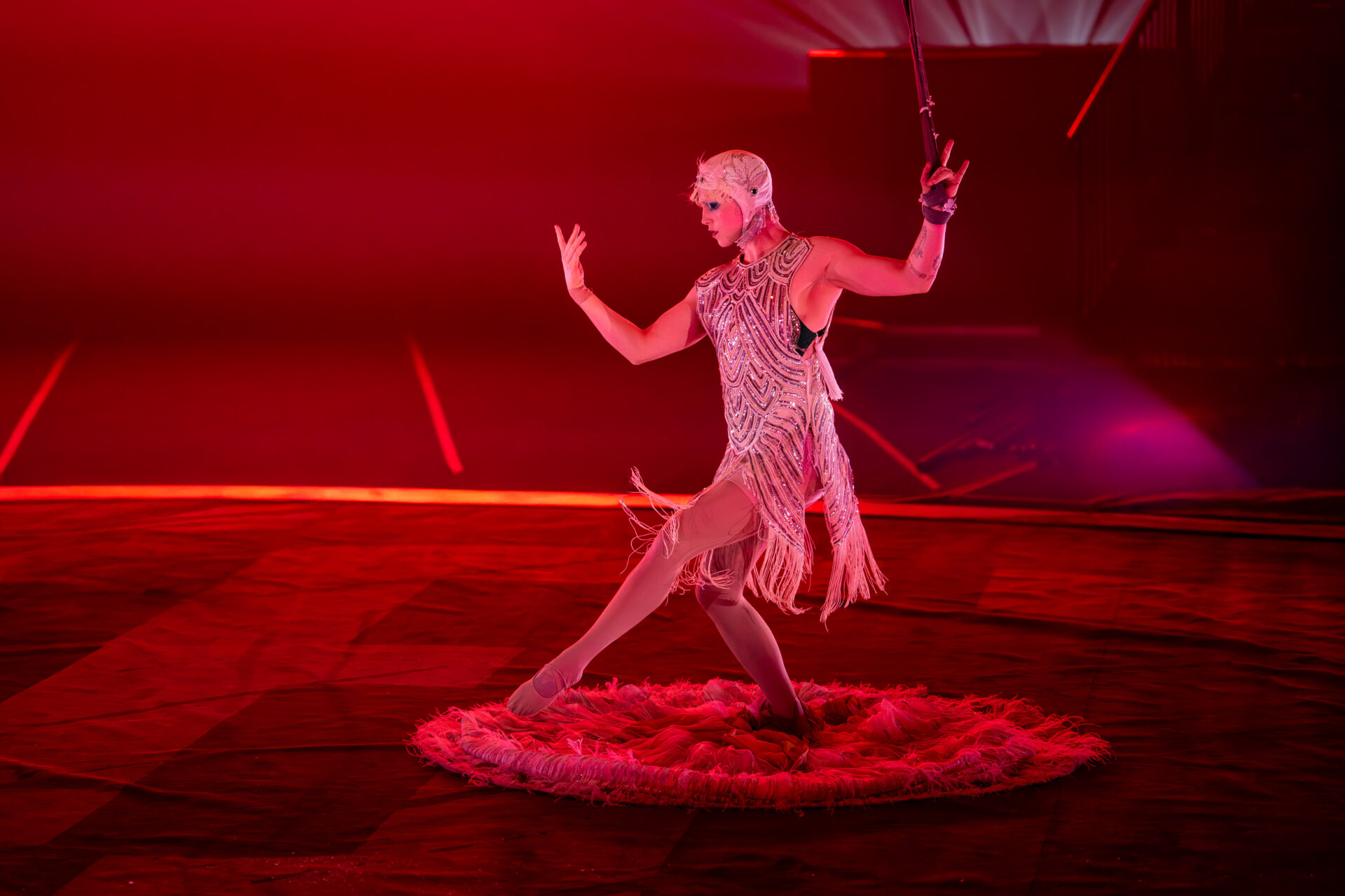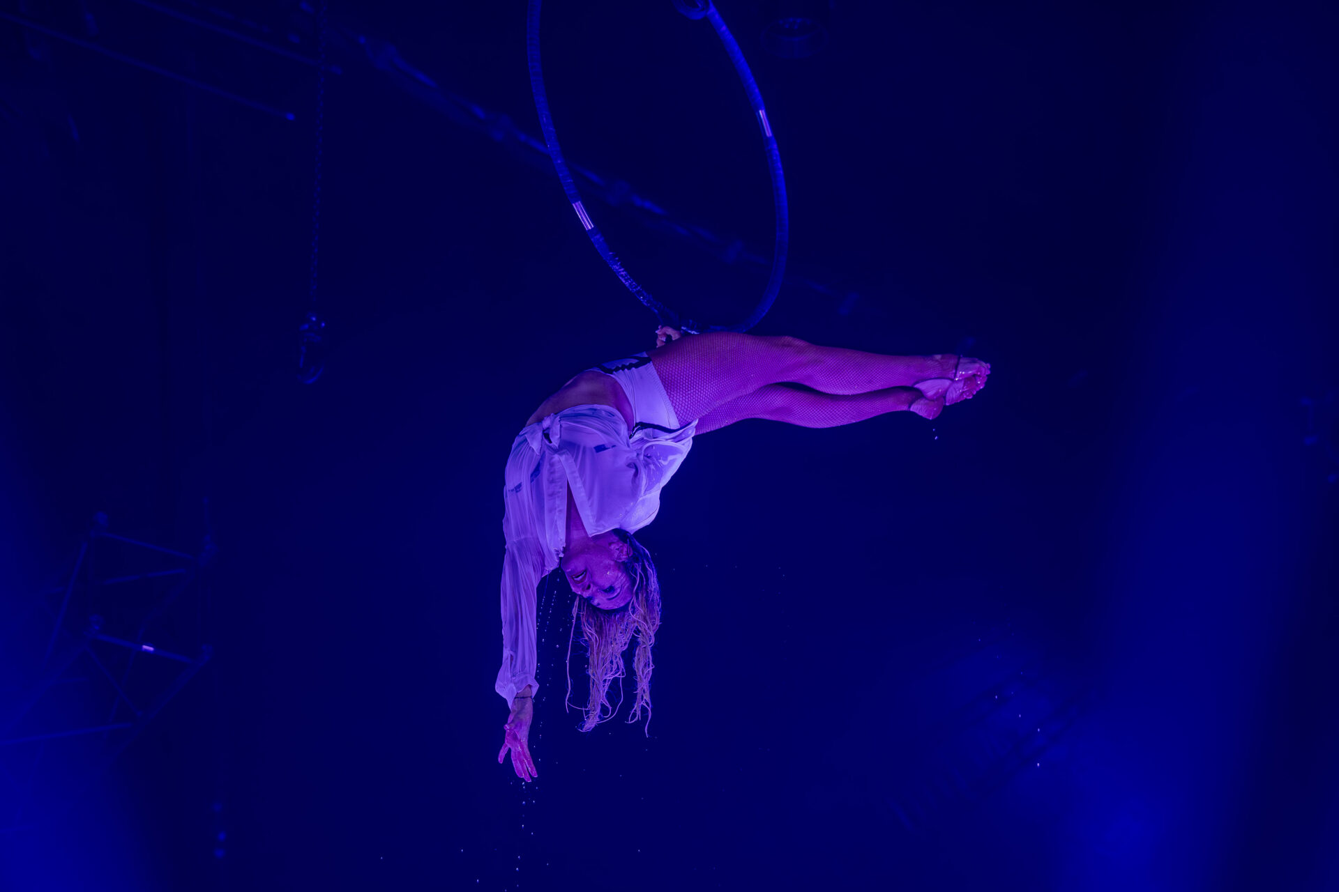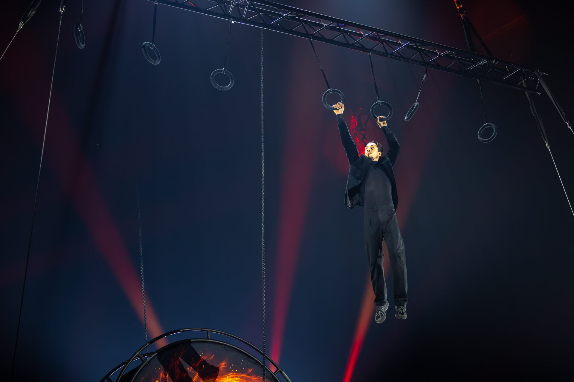 Einen atmosphärischen Akzent setzt Laura Miller. Wenn sie aus dem gläsernen Bassin mit ihrem Luftring in die Höhe schießt, entsteht ein kraftvolles Zusammenspiel aus Licht, Höhe und Bewegung. Die Nummer bleibt durchgehend dynamisch, steigert kontinuierlich Spannung und Tempo und fügt sich nahtlos in das Gesamtbild der Show ein.