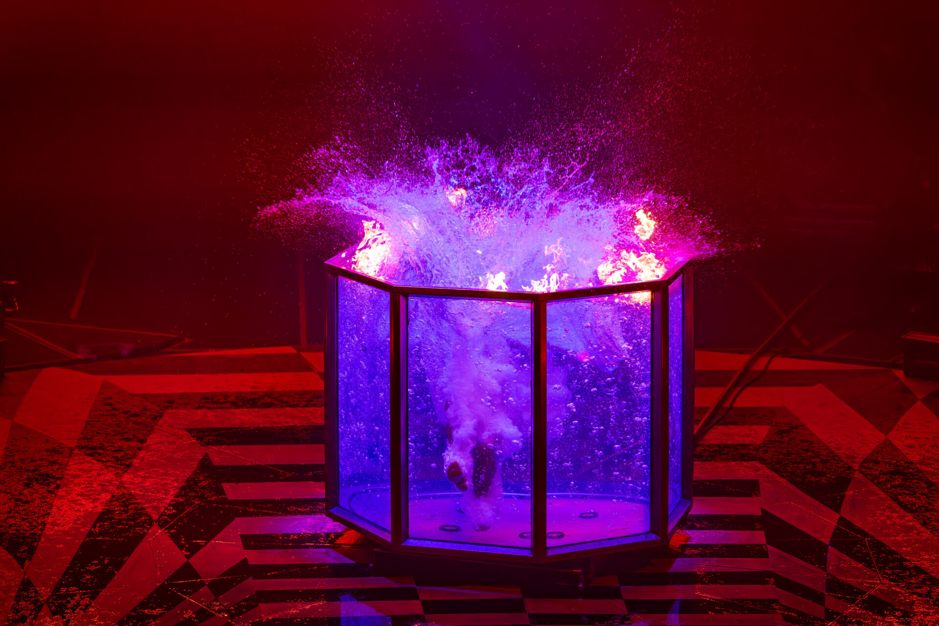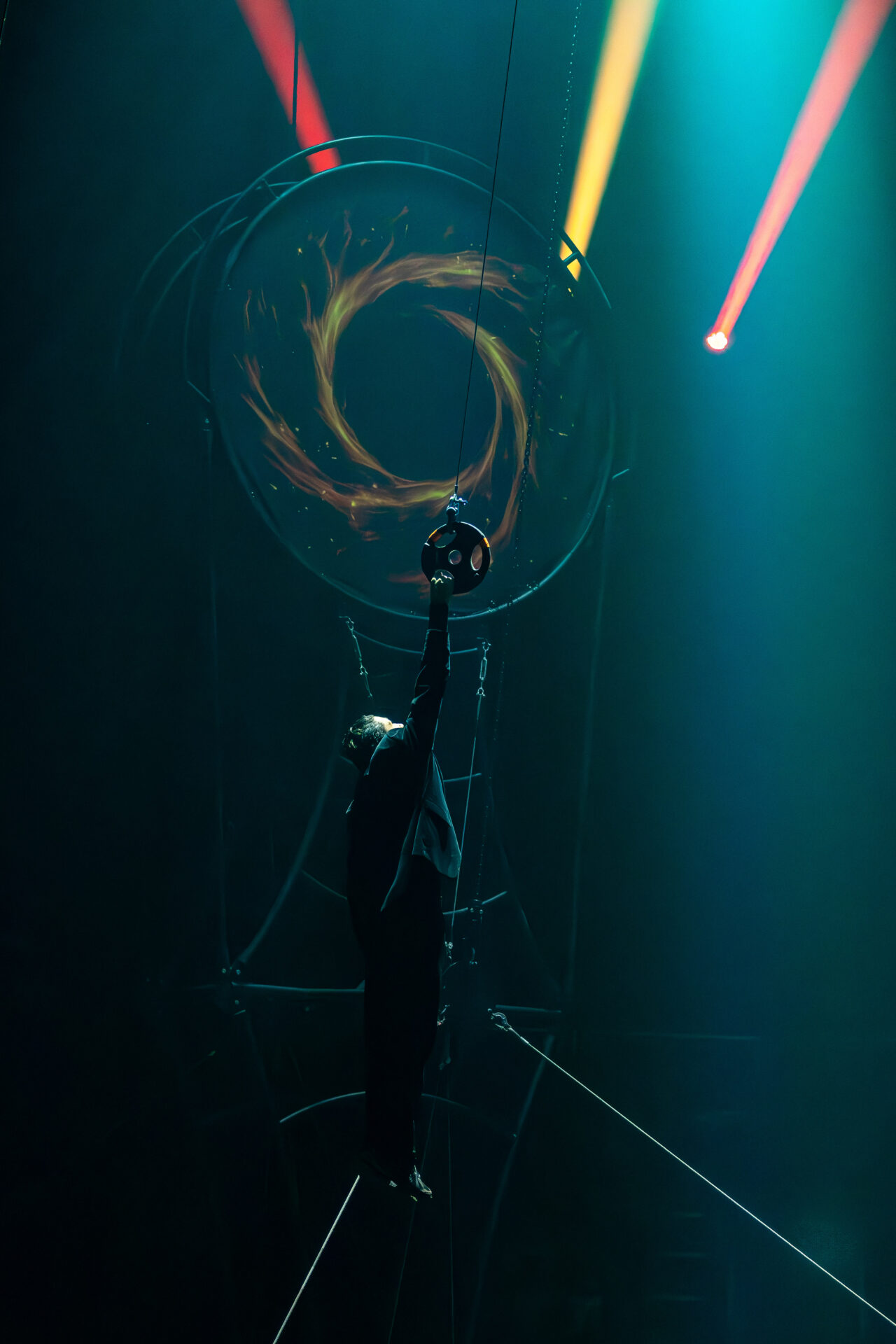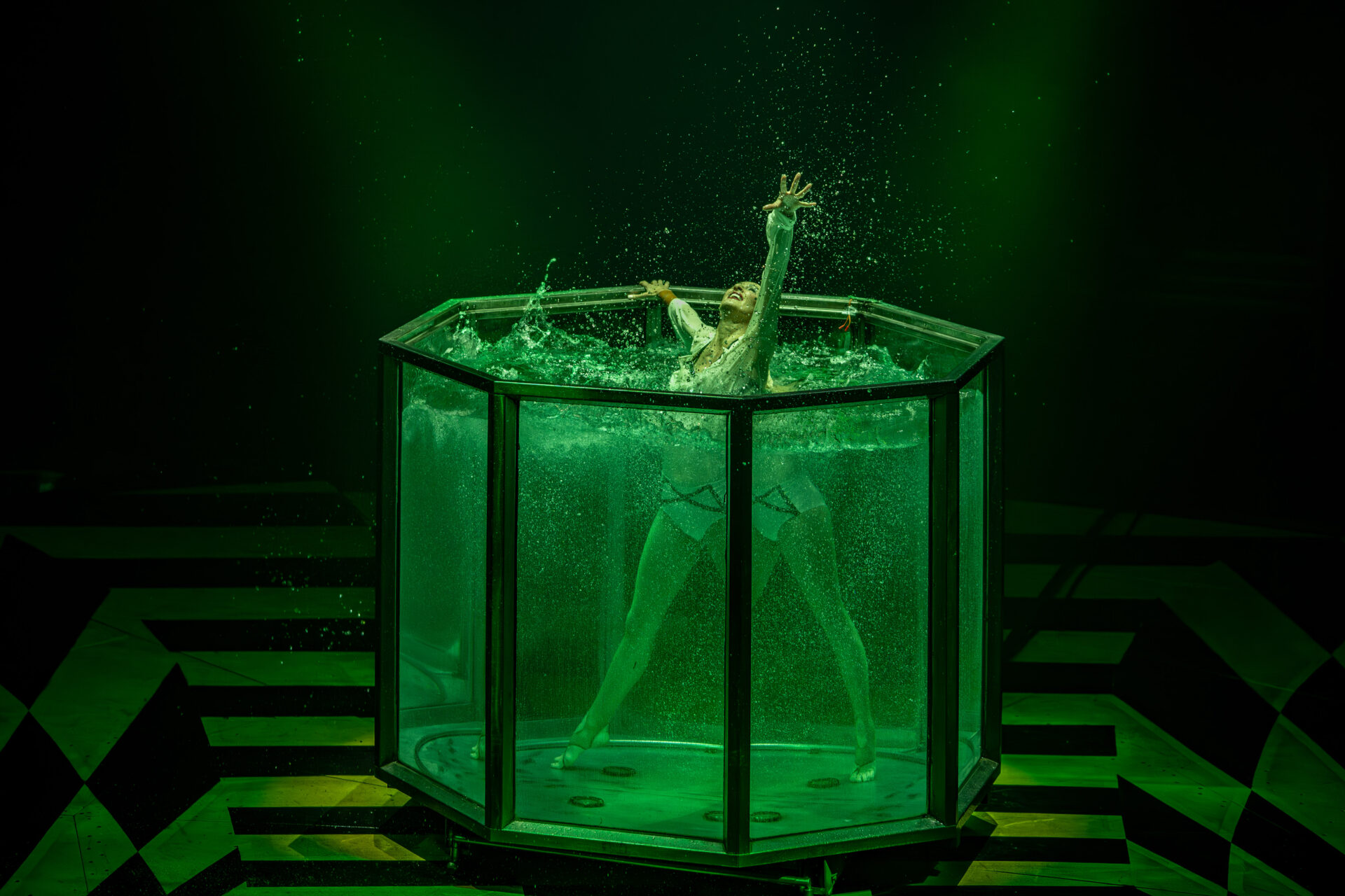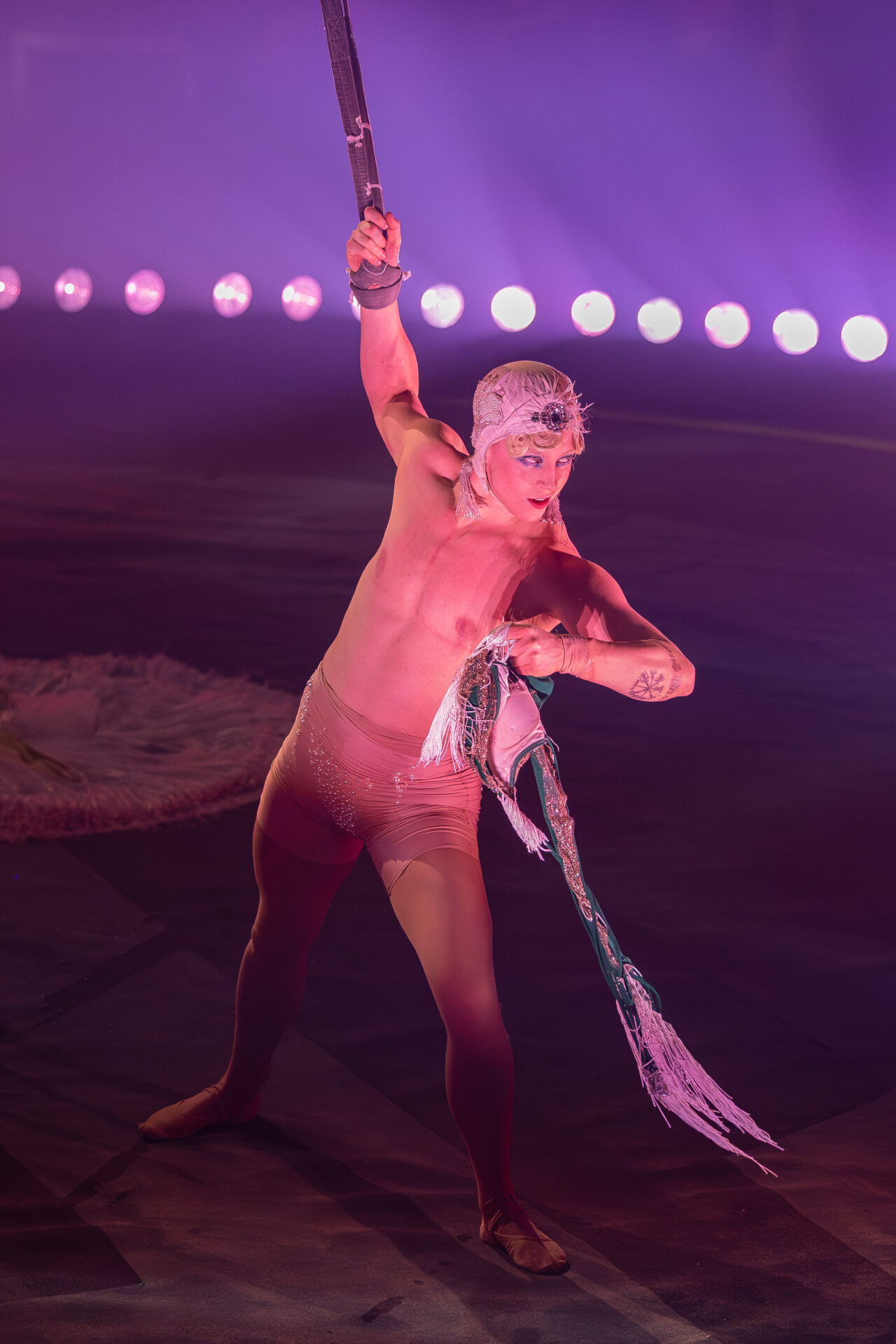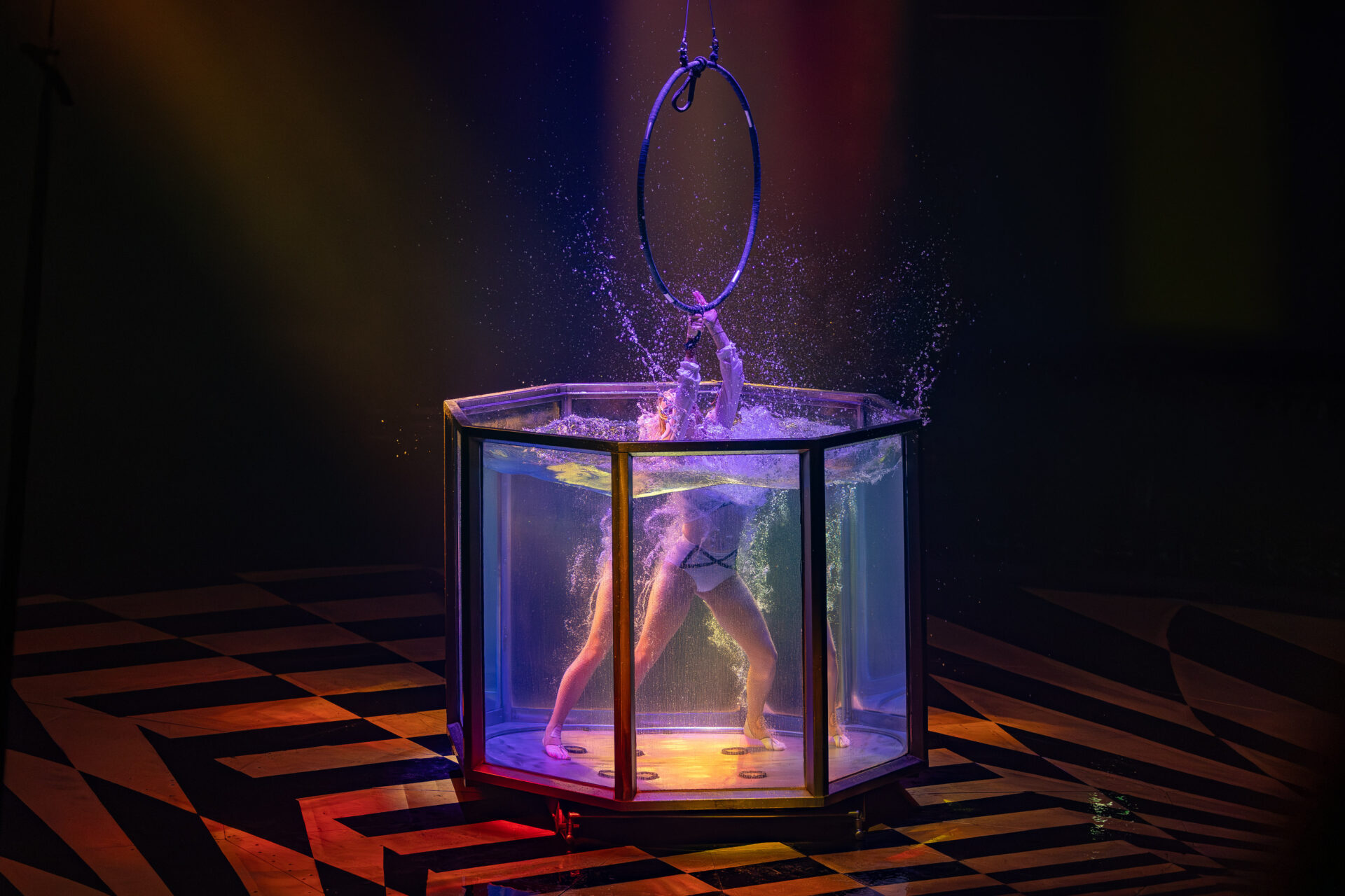Einen atmosphärischen Akzent setzt Laura Miller. Wenn sie aus dem gläsernen Bassin mit ihrem Luftring in die Höhe schießt, entsteht ein kraftvolles Zusammenspiel aus Licht, Höhe und Bewegung. Die Nummer bleibt durchgehend dynamisch, steigert kontinuierlich Spannung und Tempo und fügt sich nahtlos in das Gesamtbild der Show ein.