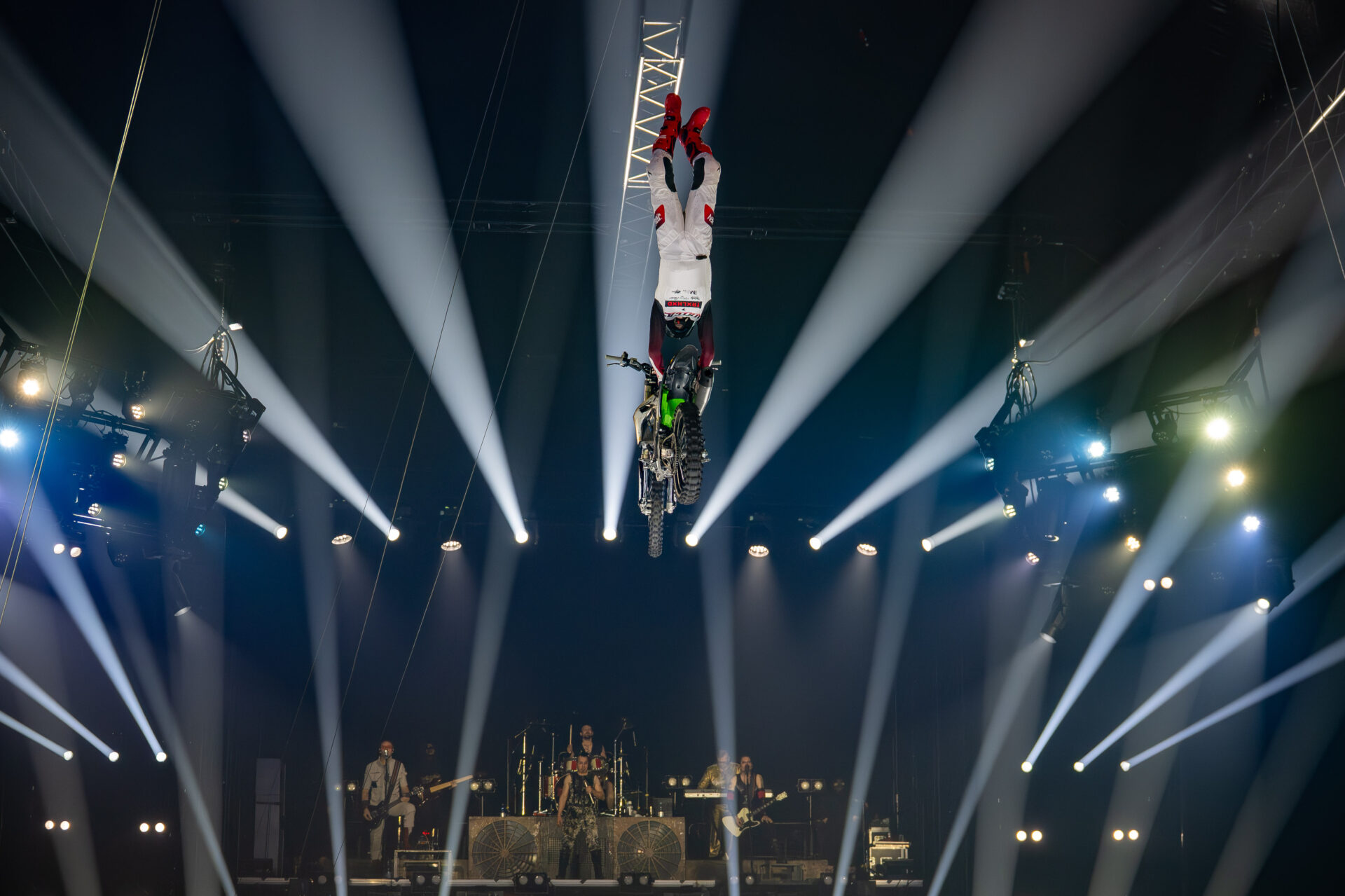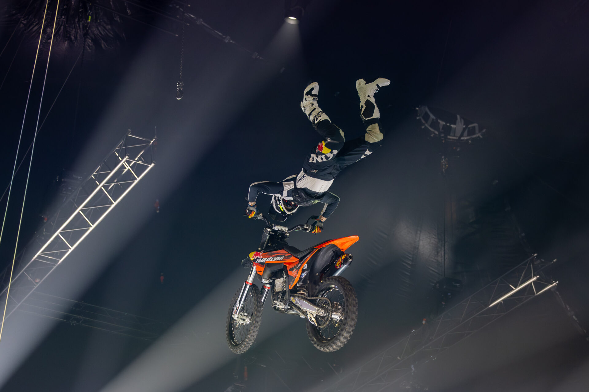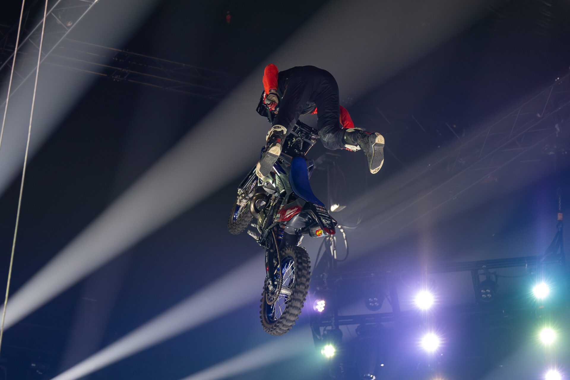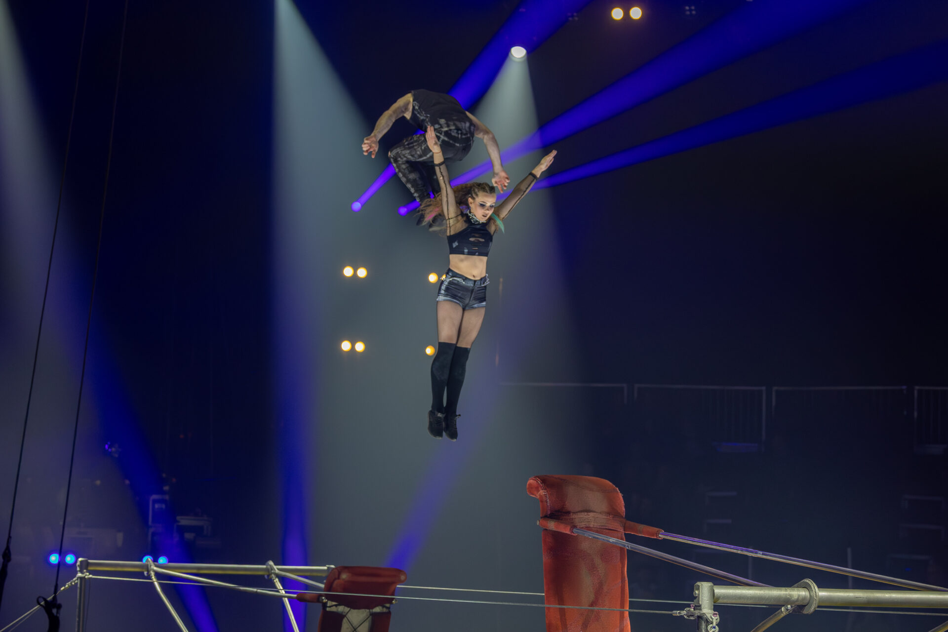 Für einen der lautesten und publikumswirksamsten Momente sorgen die Mad Flying Bikes. Mit ihren Motorrädern nutzen sie den Raum der Manege bis unter die Zeltkuppel aus und liefern eine Abfolge kraftvoller Sprünge, die das klassische Flic-Flac-Prinzip von Risiko und Dynamik konsequent fortführen.