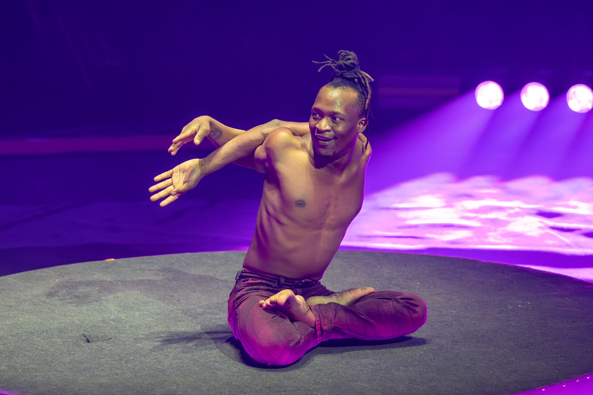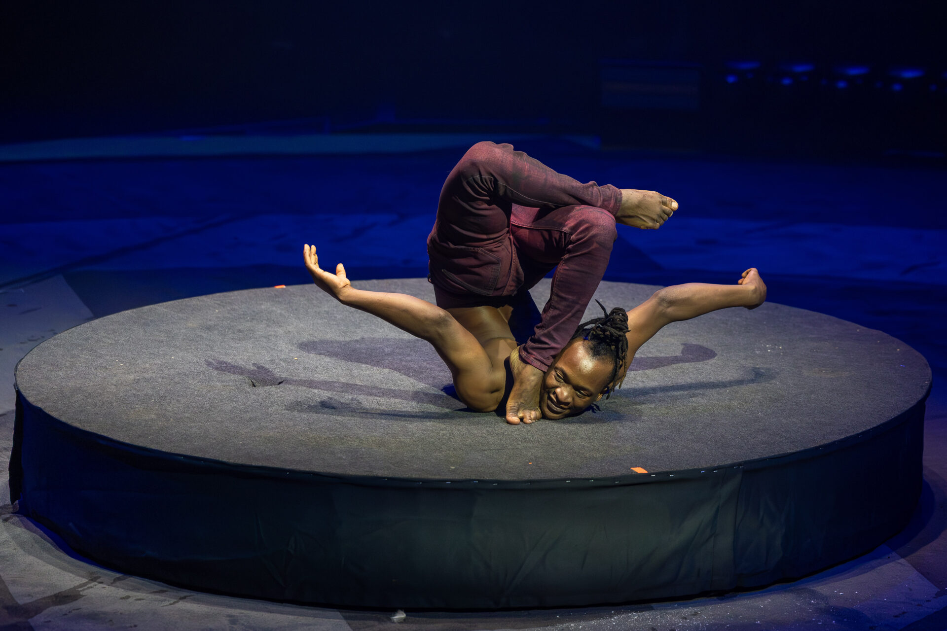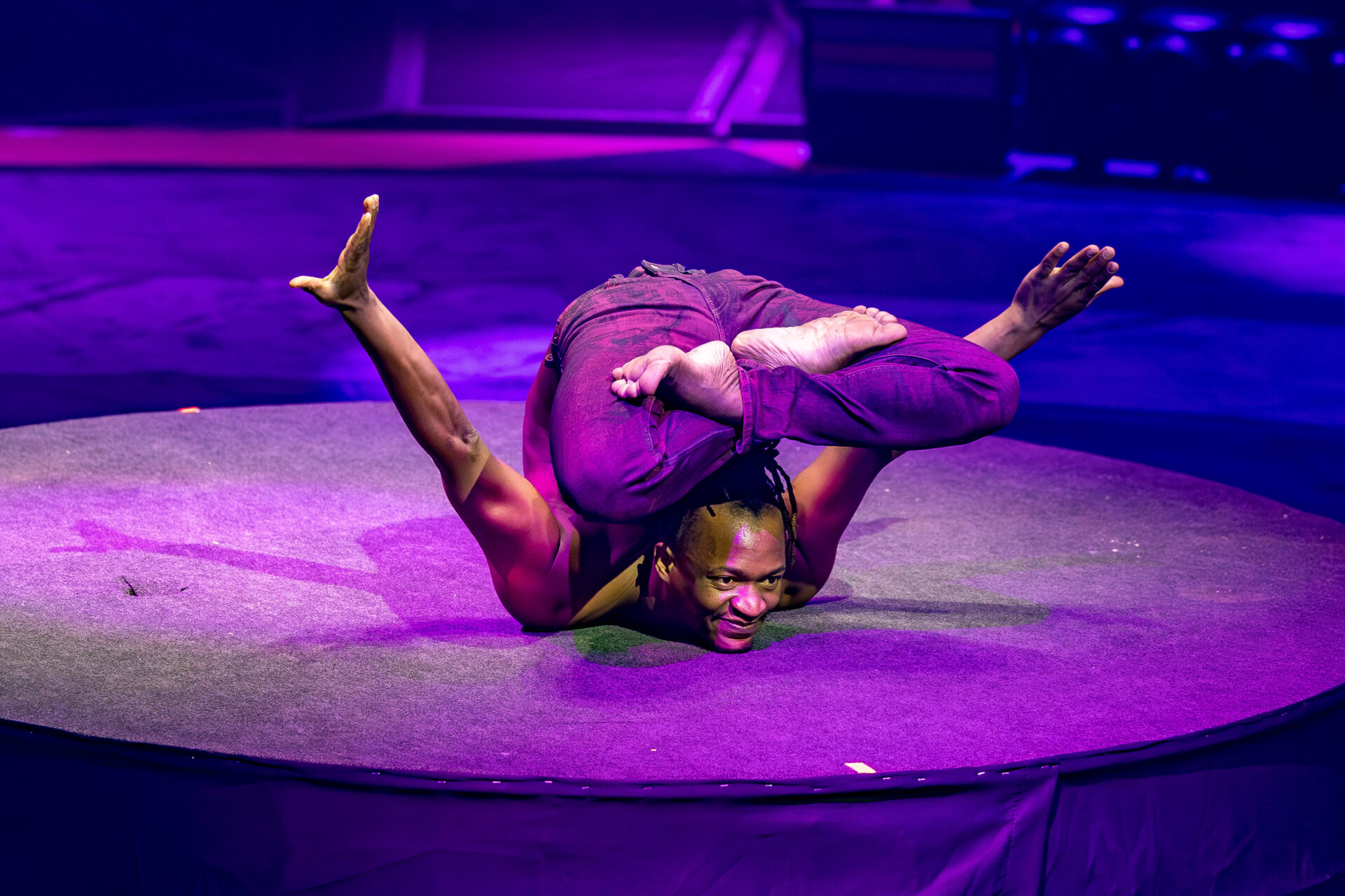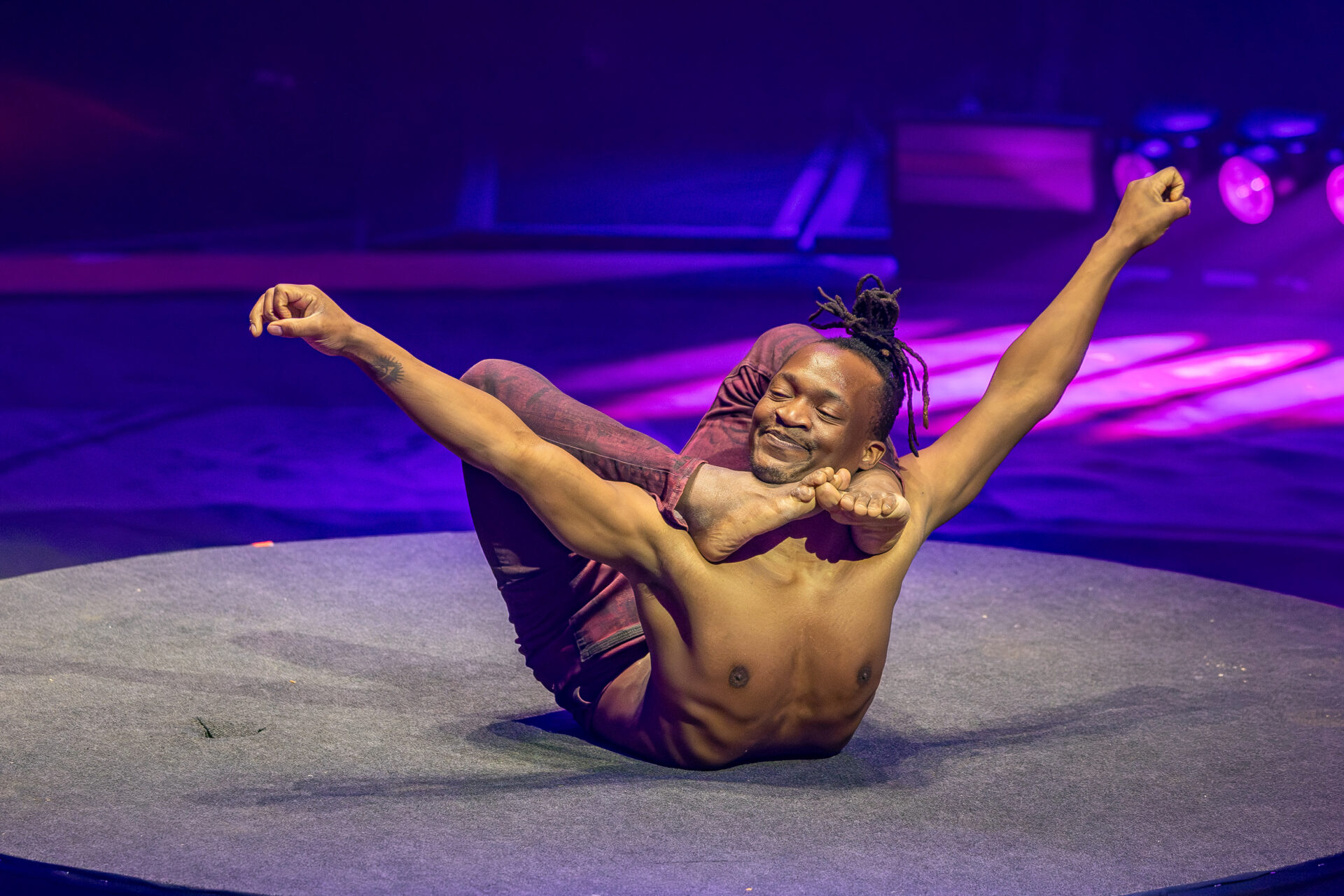 Mit extremer Beweglichkeit arbeitet der Kontorsionsartist Juma. Seine Nummer zeigt ungewöhnliche Körperpositionen und kontrollierte Verformungen, die die körperlichen Möglichkeiten dieser Disziplin deutlich machen, ohne dabei auf theatrale Effekte angewiesen zu sein.