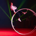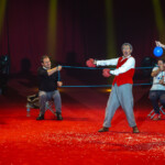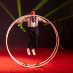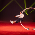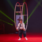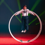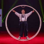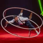 Kurz darauf bringt Konstantin Muraviev mit einem Rhönrad die Manege zum Lachen. Was wie Chaos aussieht, ist in Wahrheit perfekt getimte Artistik mit komischer Note.