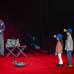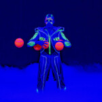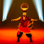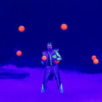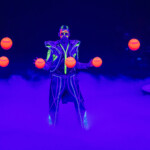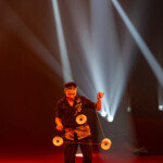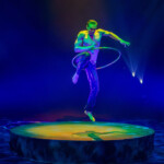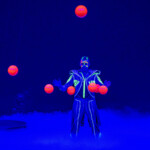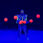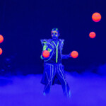 Im Zelt wird es dunkel und die artistische Reise beginnt mit einer faszinierenden Neon-Jonglage. Leuchtende orangefarbene Bälle schweben durch die dunkle Manege, sodass sie wie kleine Planeten aussehen. Dieser Auftakt setzt sofort den Ton: modern, überraschend und voller Fantasie.