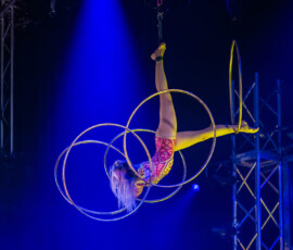Olha Rezekina zeigte, wie man mit Hula-Hoops nicht nur jongliert, sondern Geschichten erzählt. Ihre Performance lebte von Rhythmus, Geschwindigkeit und einer ansteckenden Bühnenpräsenz, die sich innerhalb weniger Sekunden auf den ganzen Saal übertrug. Ihre Reifen wurden zu rotierenden Linien im Raum – präzise, verspielt und überraschend.