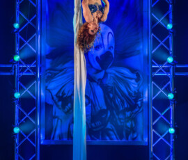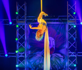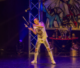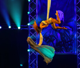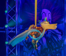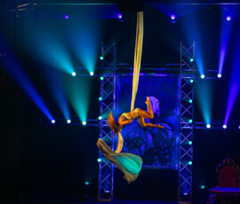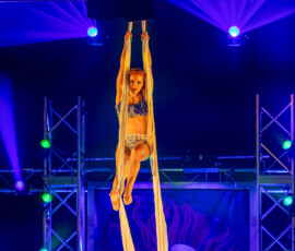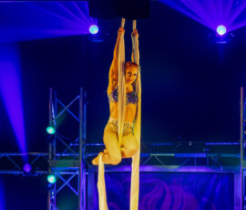 Kateryna Gurina beeindruckte am Vertikaltuch. Man sah sofort, dass sie ihrem Requisit mit leidenschaftlicher Hingabe begegnet. Kraftvolle Aufstiege, kontrollierte Drops und elegante Fallsequenzen ließen sowohl ihr Können als auch ihre Ausbildung am renommierten Zirkus-College in Kiew sichtbar werden. Eine Nummer voller Konzentration, Mut und erzählerischer Intensität.