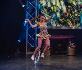 Yuliana Kaban kam – rollend, präzise, unkompliziert – und ließ das Einrad aussehen, als sei es das selbstverständlichste Requisit der Welt. Sie kreiste über die Bühne, spielte mit Balancepunkten und Richtungswechseln und vereinte ihre technische Finesse mit einer großen Portion Charme und Lächeln. Ein Act, der einlädt, sich an der Freude der Artistin zu beteiligen.