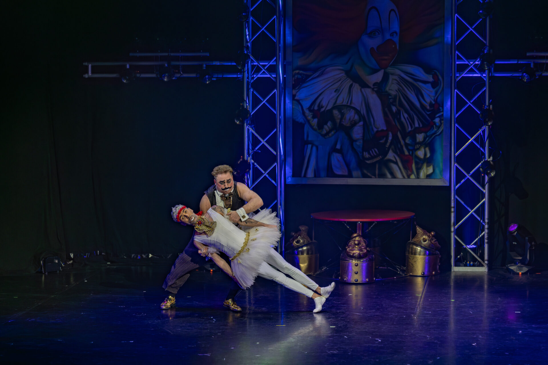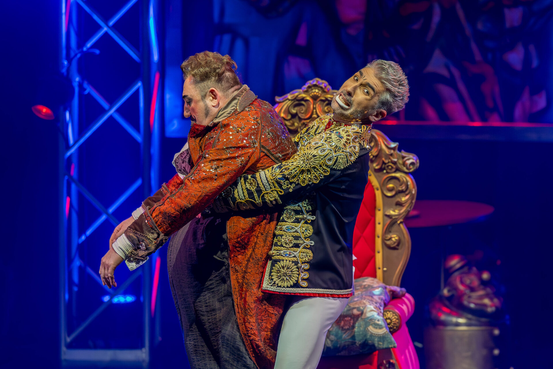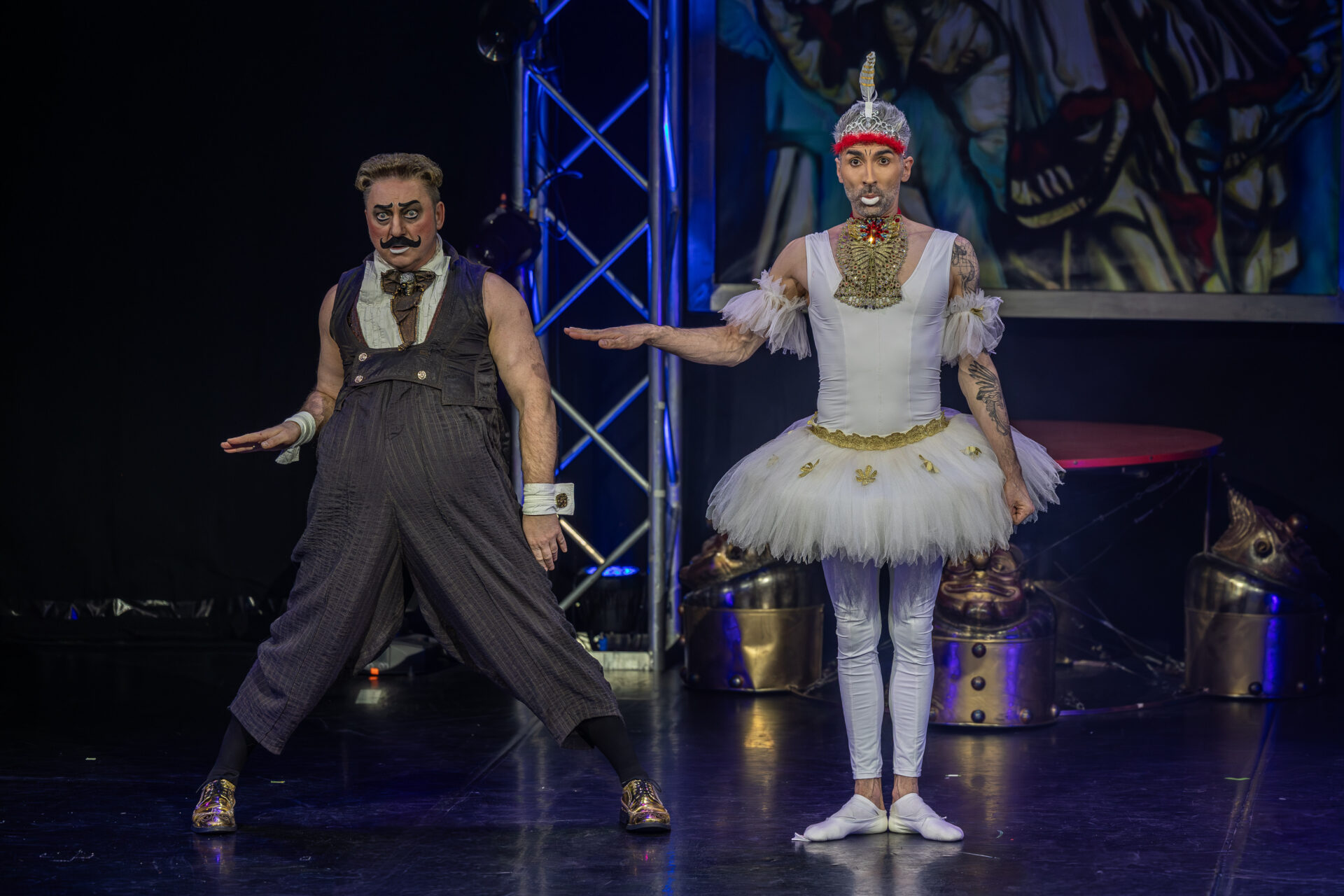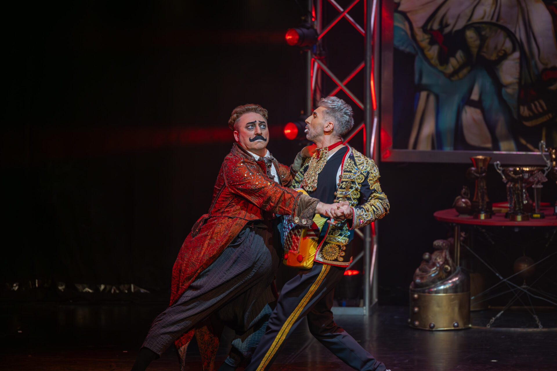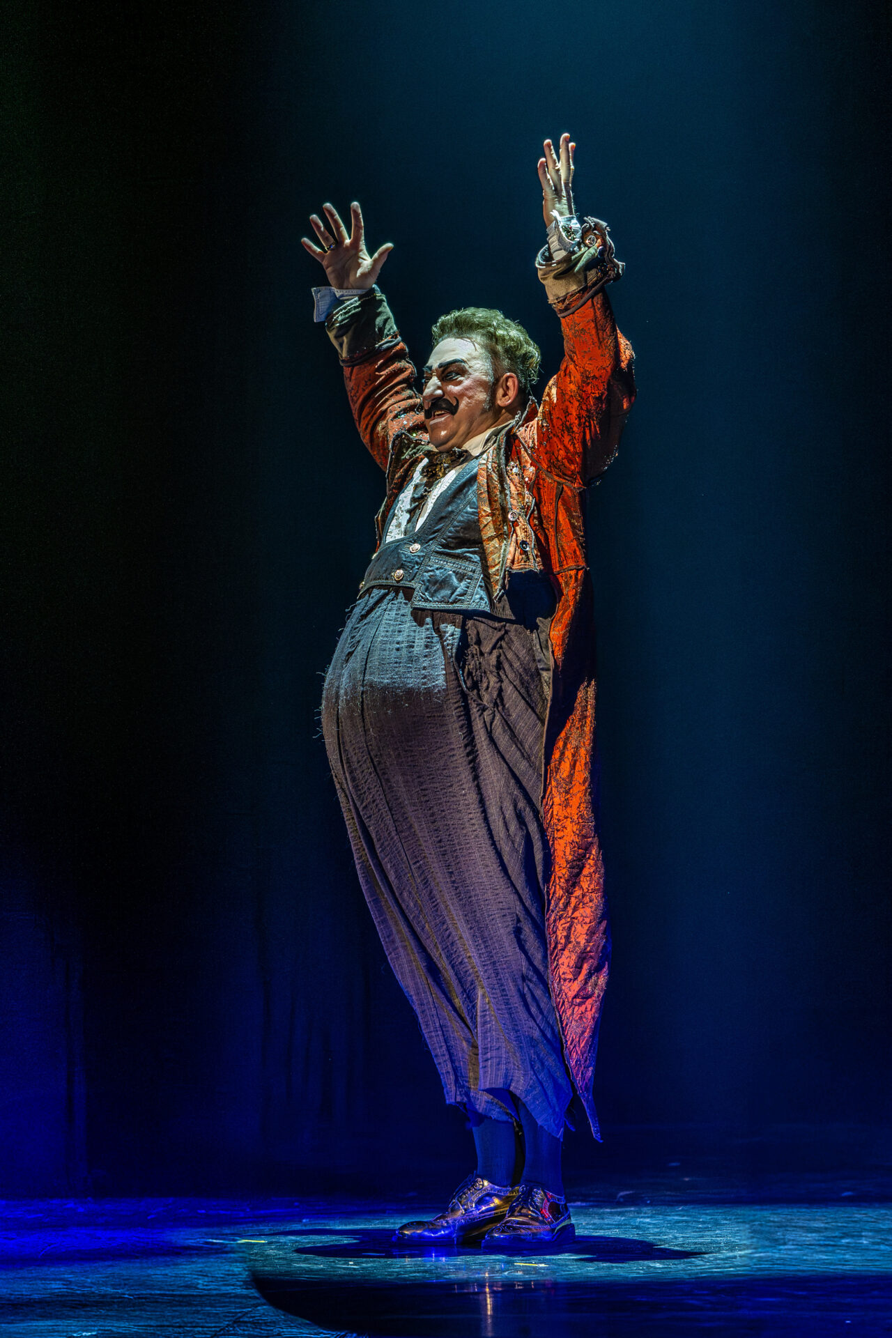 In mehreren Sequenzen trat er gemeinsam mit Alexey Bitkine, dem Ehemann und Flying-Pole-Partner von Tatyana, auf. Die beiden bildeten ein glänzend aufgelegtes Duo, das mit Timing, trockenem Witz und feiner Situationskomik die Bühne eroberte. Ein komisches Tandem, das Slapstick und Artistik zusammenführte, ohne dabei in Klamauk zu kippen. Das Zusammenspiel zwischen Eduardissimos stiller Komik und Alexeys lebendigem Temperament war nicht nur lustig, sondern auch dramaturgisch klug gesetzt – ein wiederkehrender Höhepunkt auf humoristischer Ebene.
