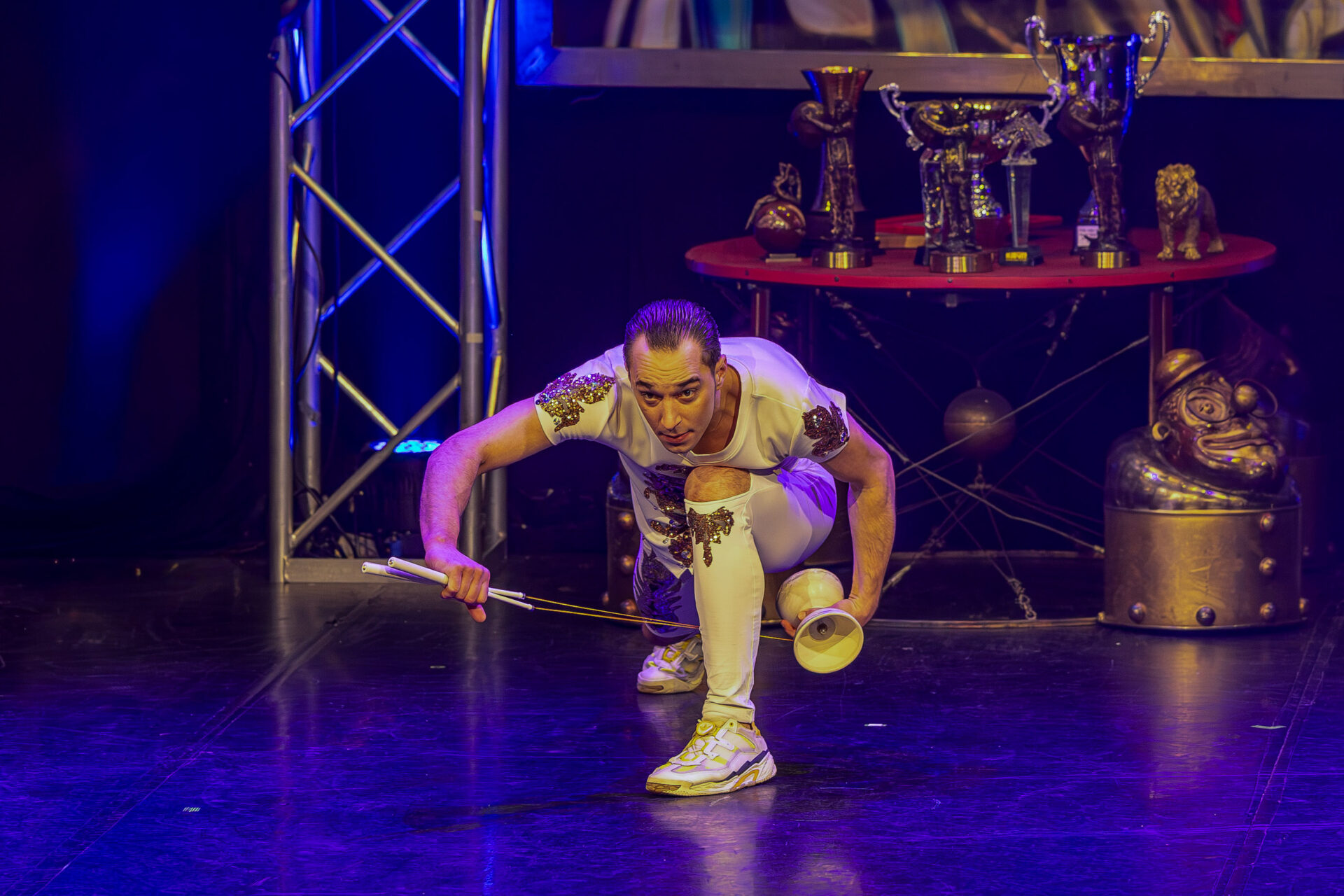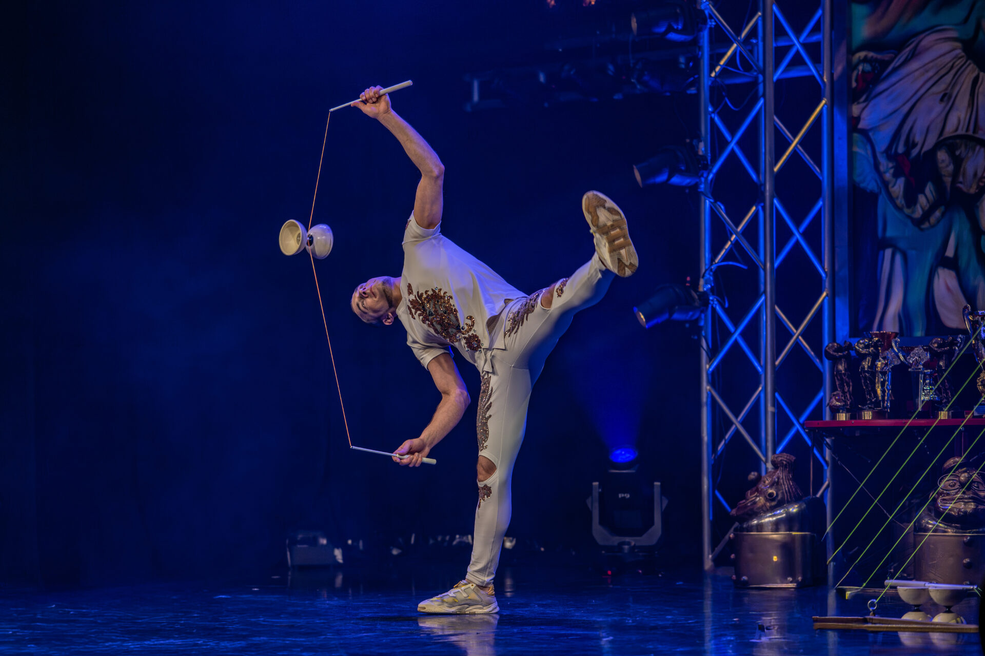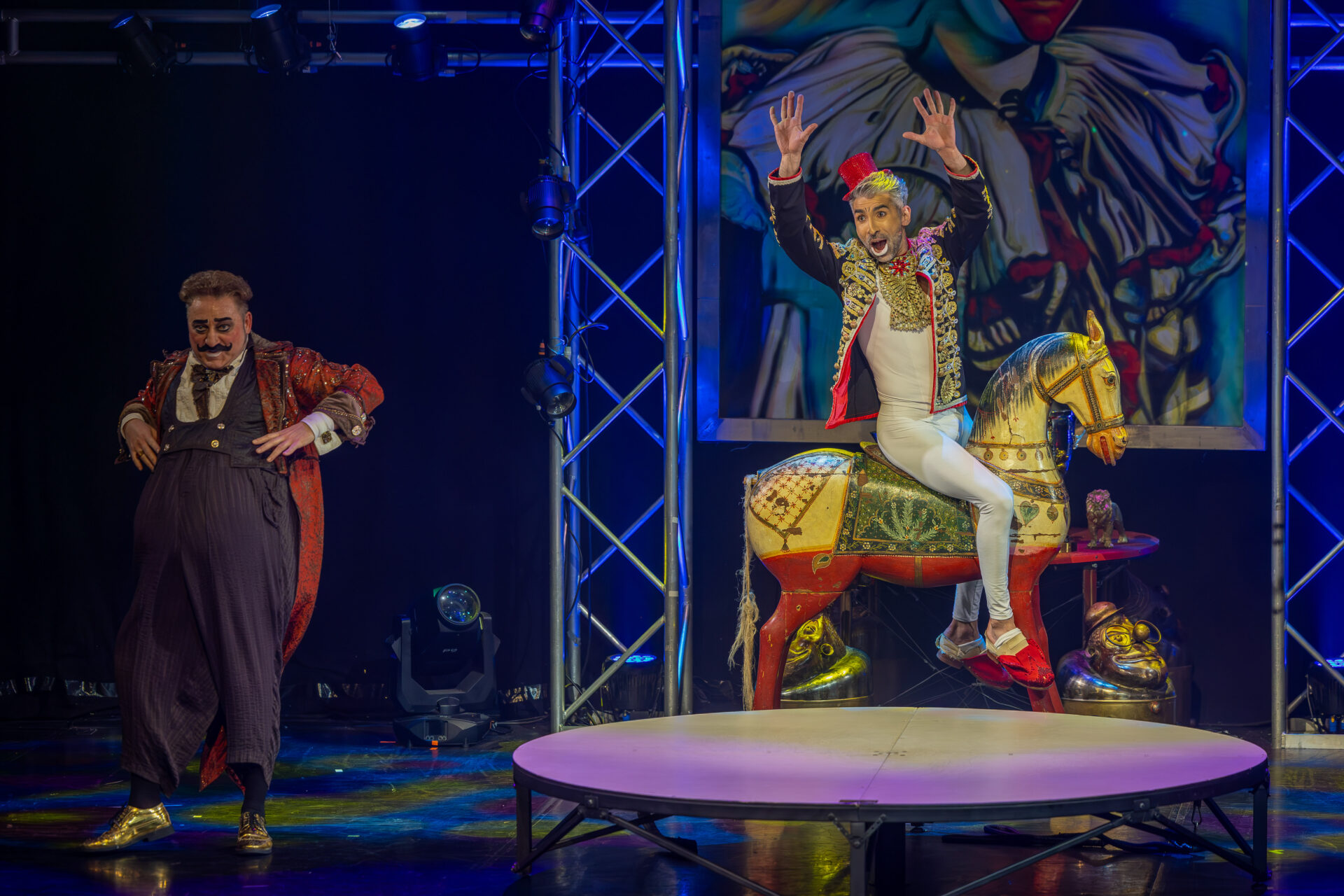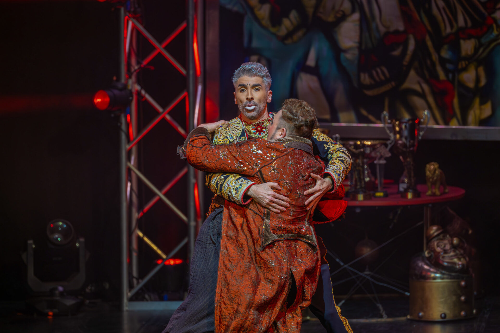 In mehreren Sequenzen trat er gemeinsam mit Alexey Bitkine, dem Ehemann und Flying-Pole-Partner von Tatyana, auf. Die beiden bildeten ein glänzend aufgelegtes Duo, das mit Timing, trockenem Witz und feiner Situationskomik die Bühne eroberte. Ein komisches Tandem, das Slapstick und Artistik zusammenführte, ohne dabei in Klamauk zu kippen. Das Zusammenspiel zwischen Eduardissimos stiller Komik und Alexeys lebendigem Temperament war nicht nur lustig, sondern auch dramaturgisch klug gesetzt – ein wiederkehrender Höhepunkt auf humoristischer Ebene.