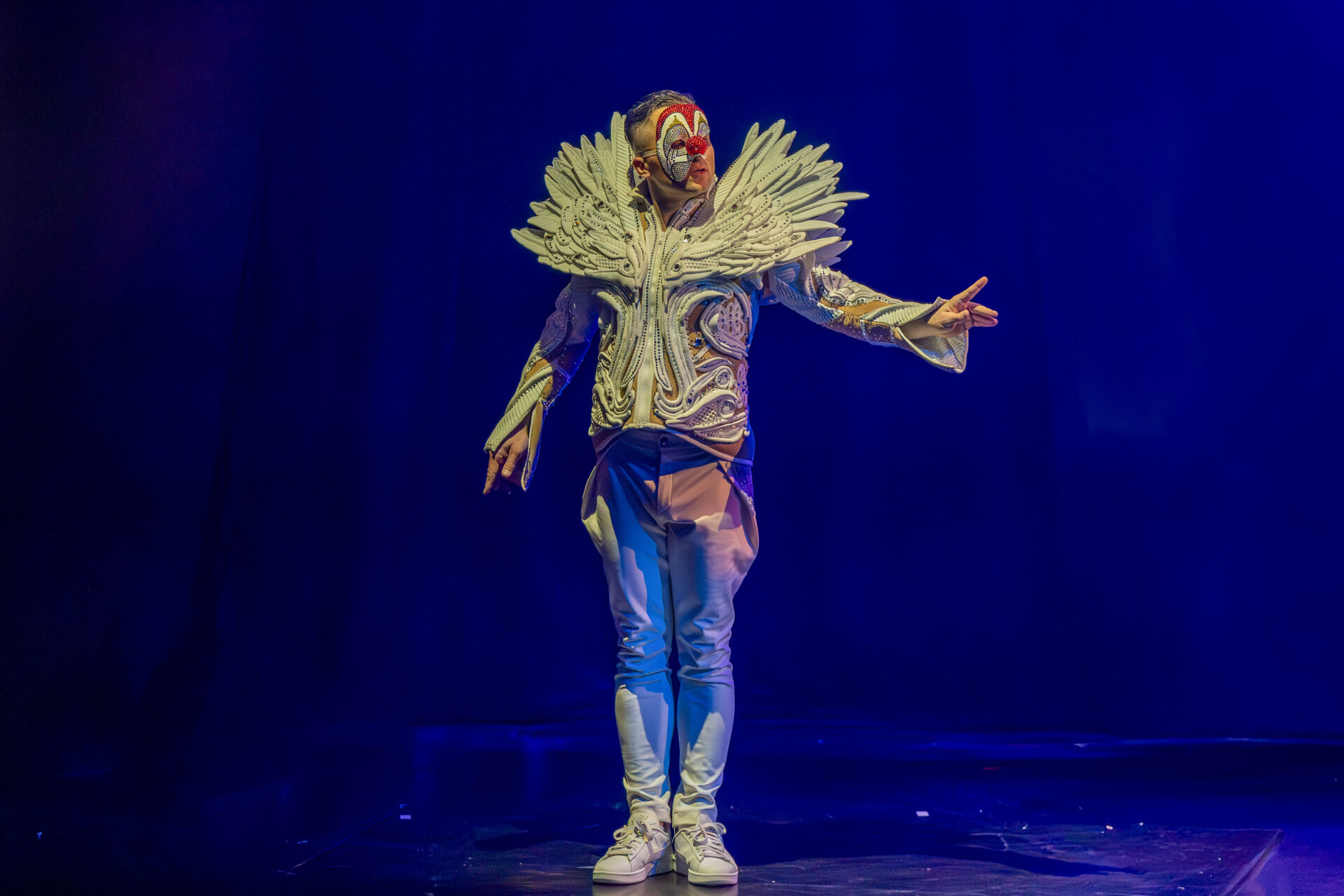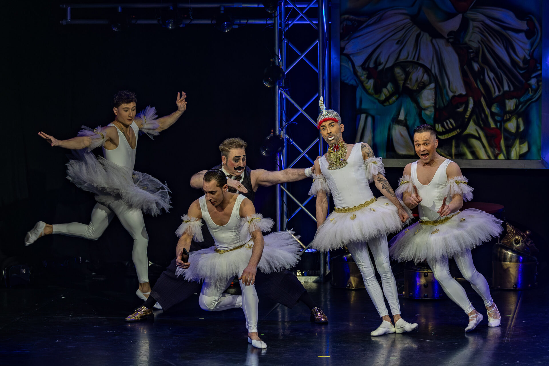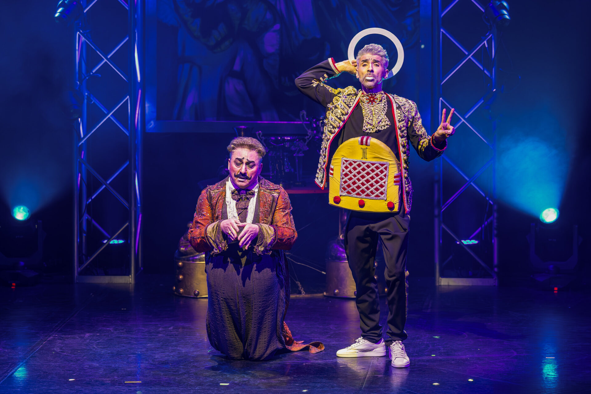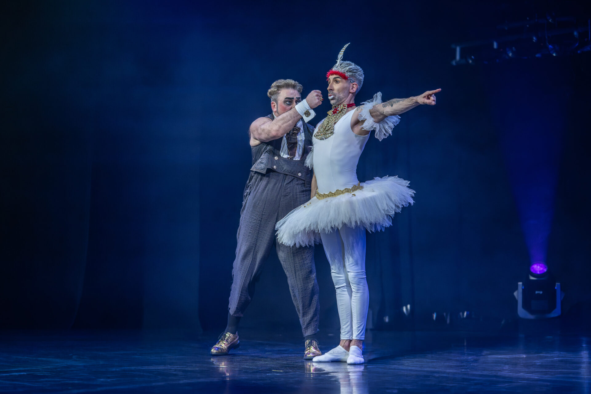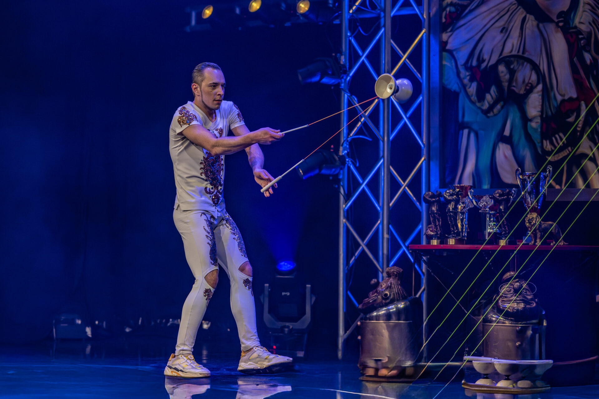 In mehreren Sequenzen trat er gemeinsam mit Alexey Bitkine, dem Ehemann und Flying-Pole-Partner von Tatyana, auf. Die beiden bildeten ein glänzend aufgelegtes Duo, das mit Timing, trockenem Witz und feiner Situationskomik die Bühne eroberte. Ein komisches Tandem, das Slapstick und Artistik zusammenführte, ohne dabei in Klamauk zu kippen. Das Zusammenspiel zwischen Eduardissimos stiller Komik und Alexeys lebendigem Temperament war nicht nur lustig, sondern auch dramaturgisch klug gesetzt – ein wiederkehrender Höhepunkt auf humoristischer Ebene.
