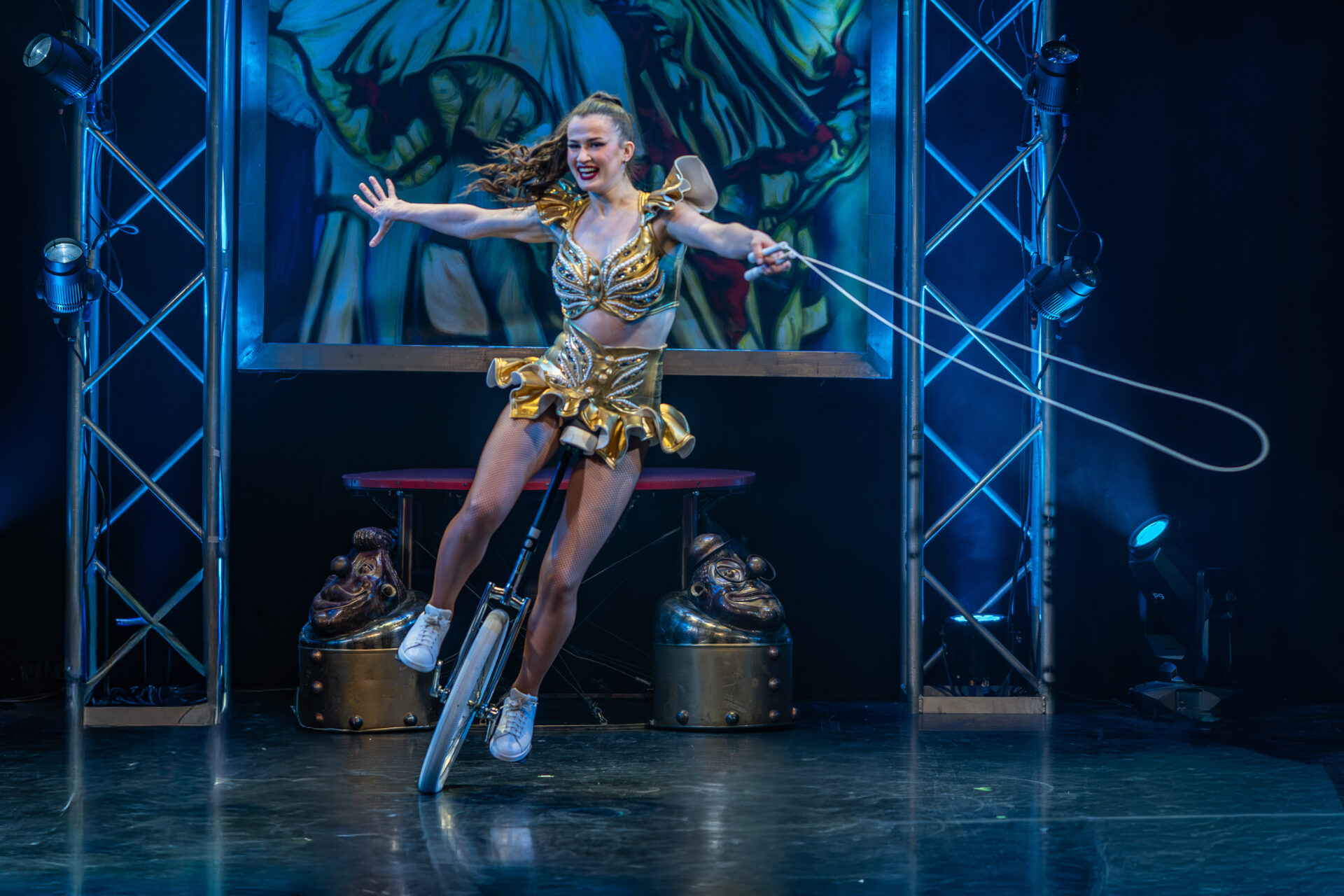 Yuliana Kaban kam – rollend, präzise, unkompliziert – und ließ das Einrad aussehen, als sei es das selbstverständlichste Requisit der Welt. Sie kreiste über die Bühne, spielte mit Balancepunkten und Richtungswechseln und vereinte ihre technische Finesse mit einer großen Portion Charme und Lächeln. Ein Act, der einlädt, sich an der Freude der Artistin zu beteiligen.