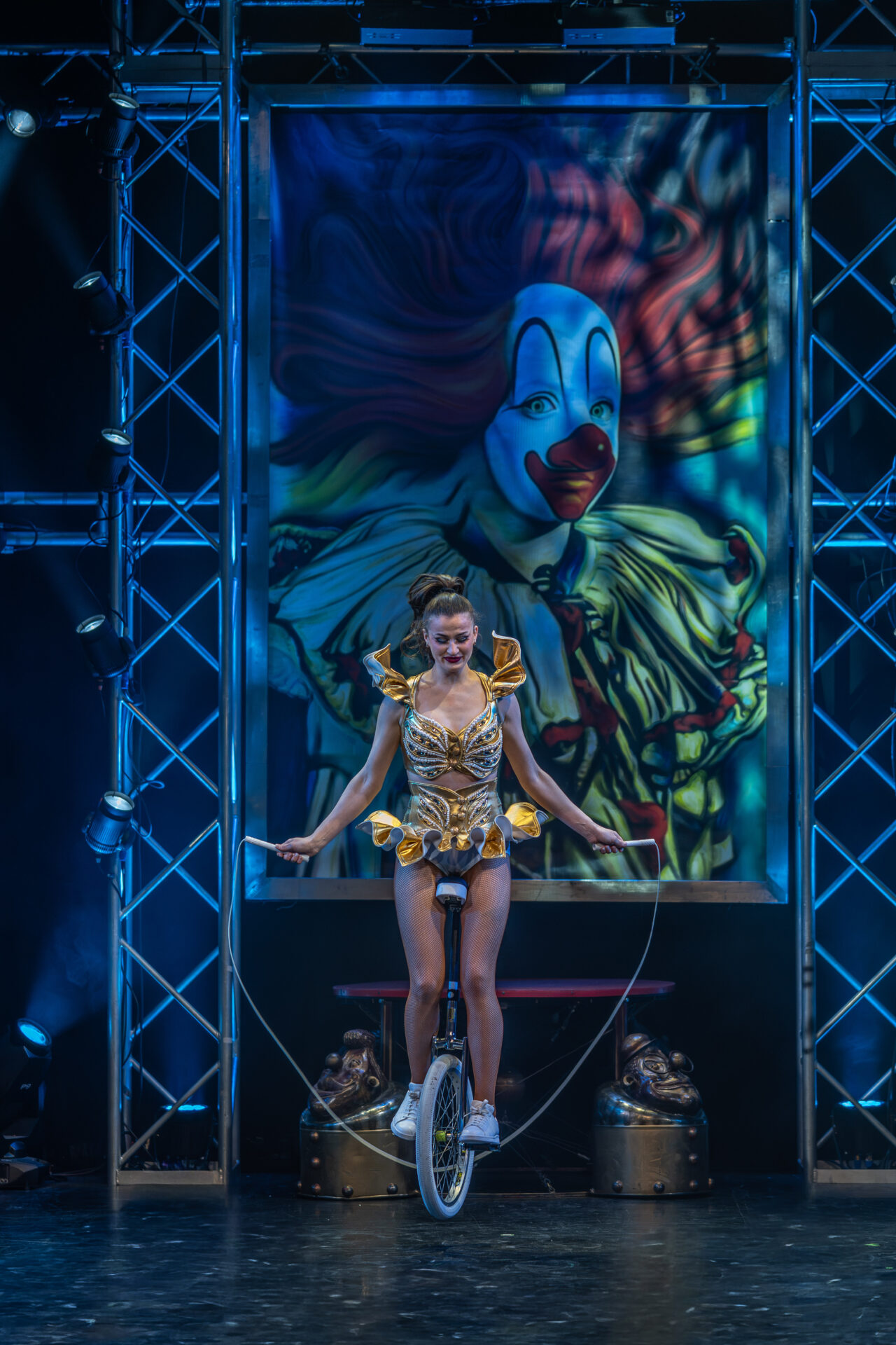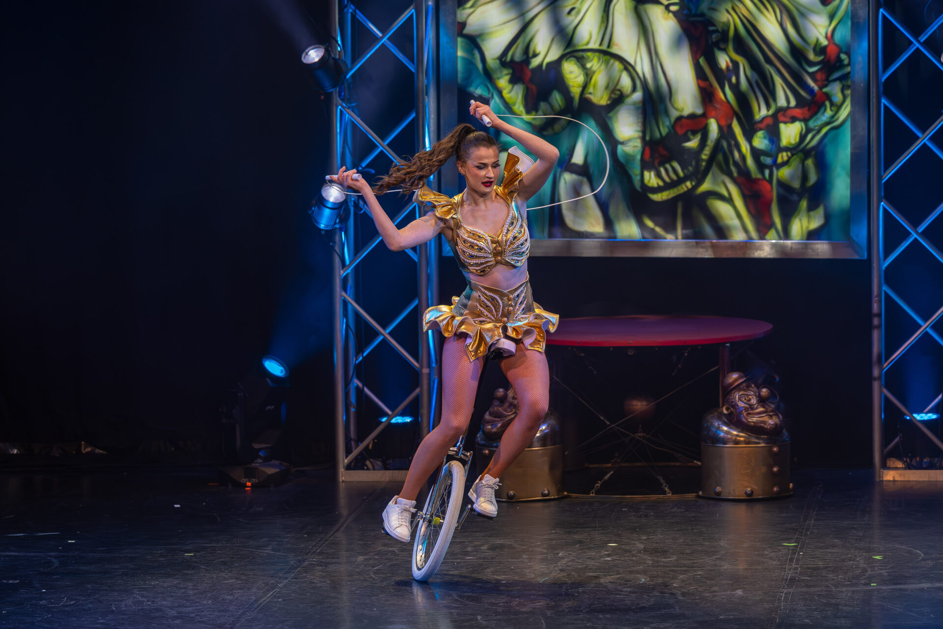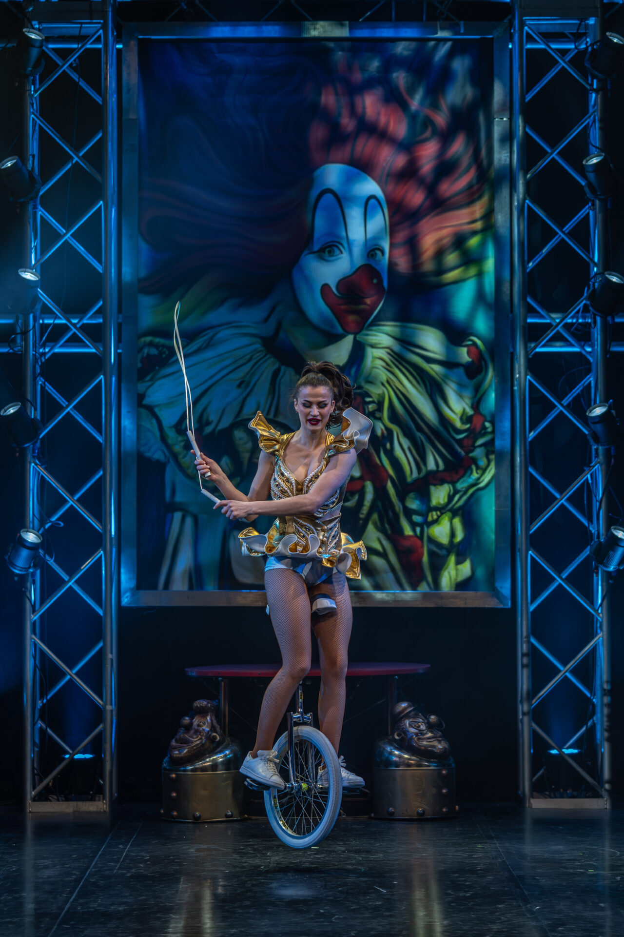 Kateryna Gurina beeindruckte am Vertikaltuch. Man sah sofort, dass sie ihrem Requisit mit leidenschaftlicher Hingabe begegnet. Kraftvolle Aufstiege, kontrollierte Drops und elegante Fallsequenzen ließen sowohl ihr Können als auch ihre Ausbildung am renommierten Zirkus-College in Kiew sichtbar werden. Eine Nummer voller Konzentration, Mut und erzählerischer Intensität.