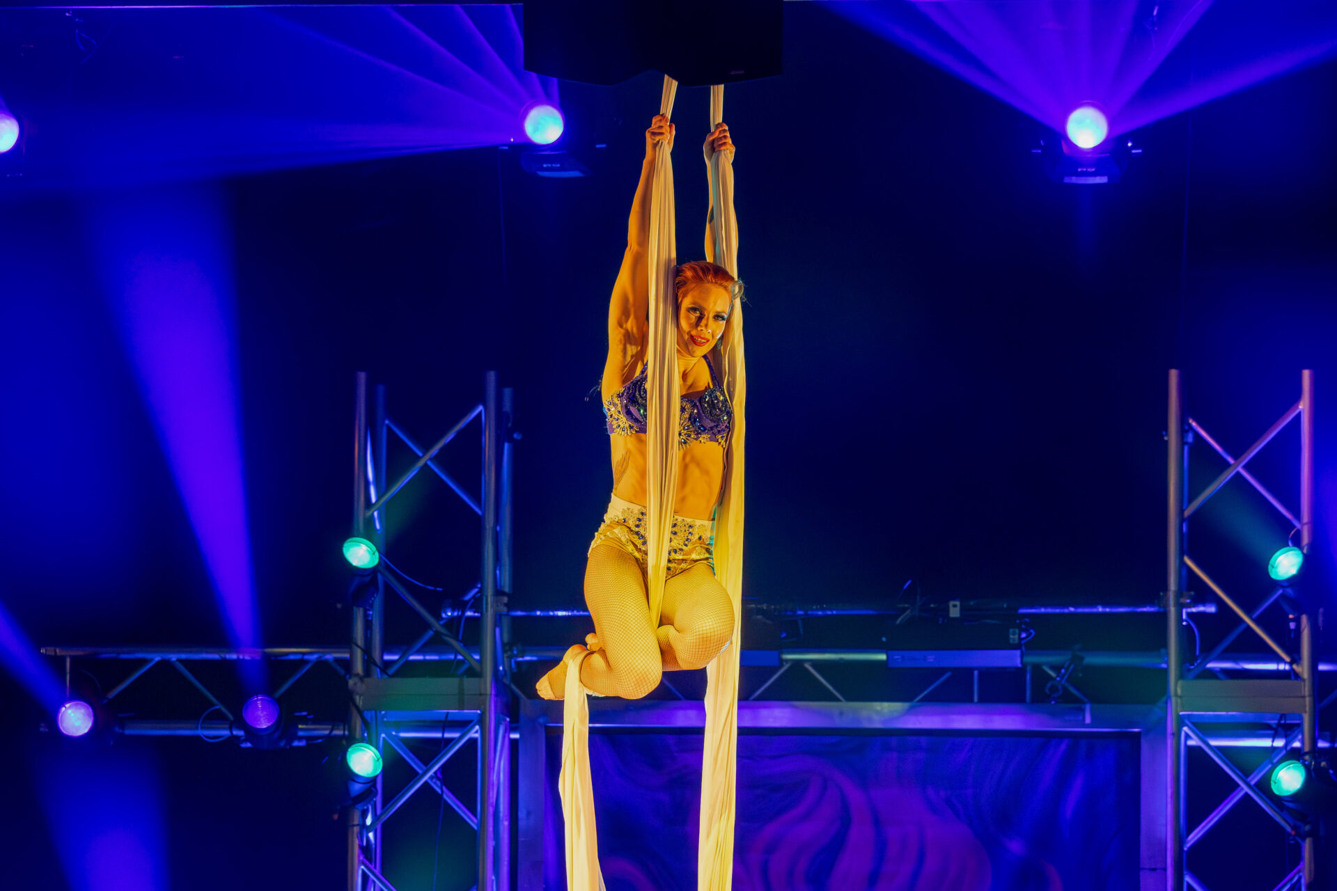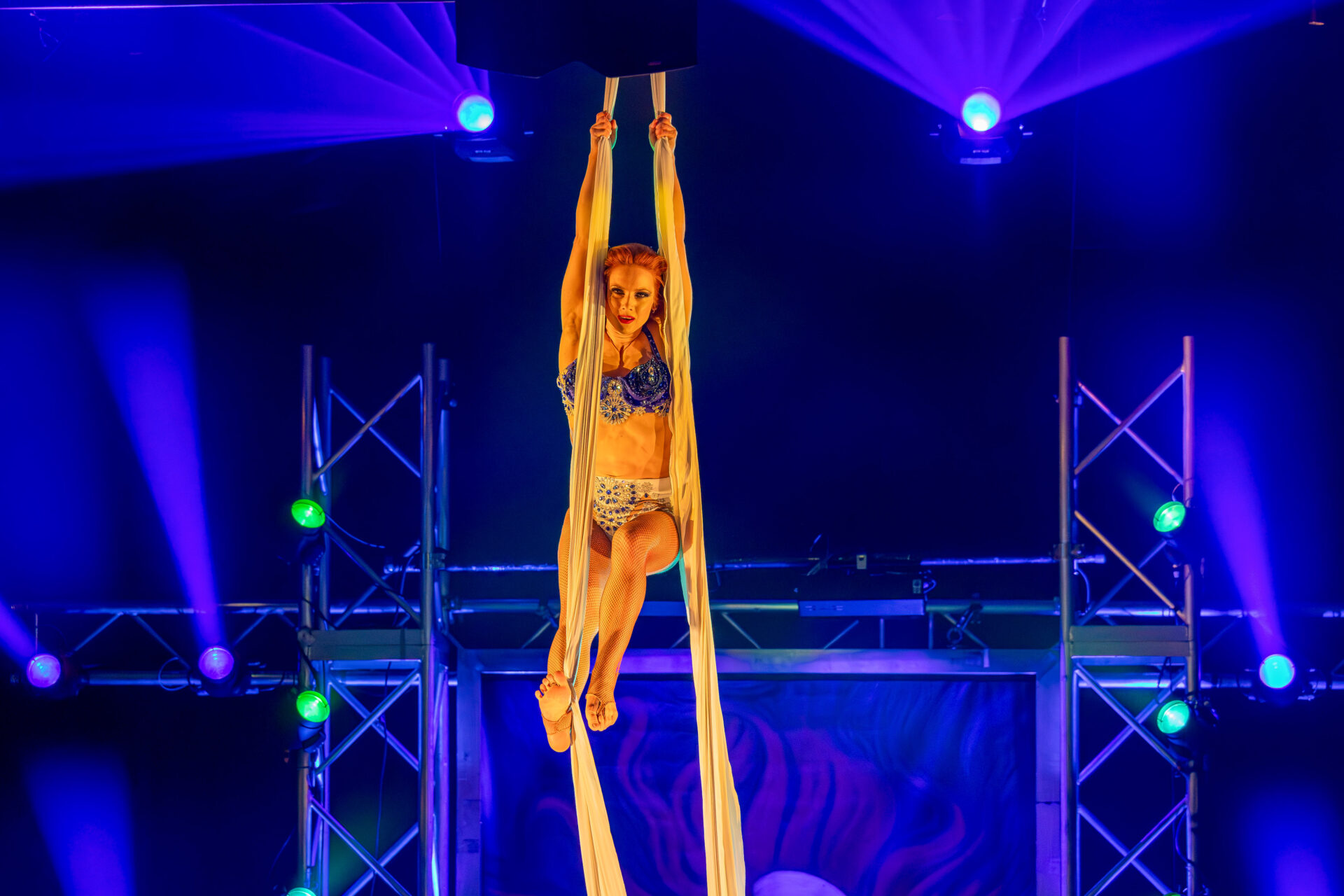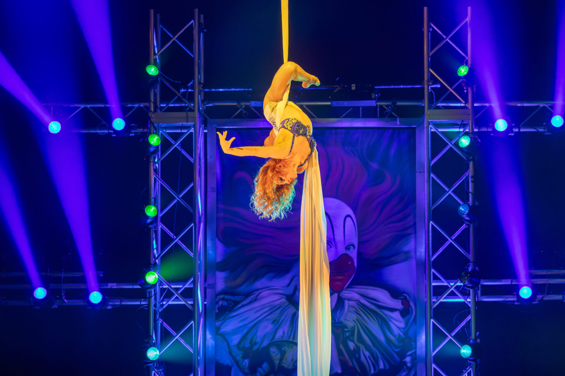 Kateryna Gurina beeindruckte am Vertikaltuch. Man sah sofort, dass sie ihrem Requisit mit leidenschaftlicher Hingabe begegnet. Kraftvolle Aufstiege, kontrollierte Drops und elegante Fallsequenzen ließen sowohl ihr Können als auch ihre Ausbildung am renommierten Zirkus-College in Kiew sichtbar werden. Eine Nummer voller Konzentration, Mut und erzählerischer Intensität.