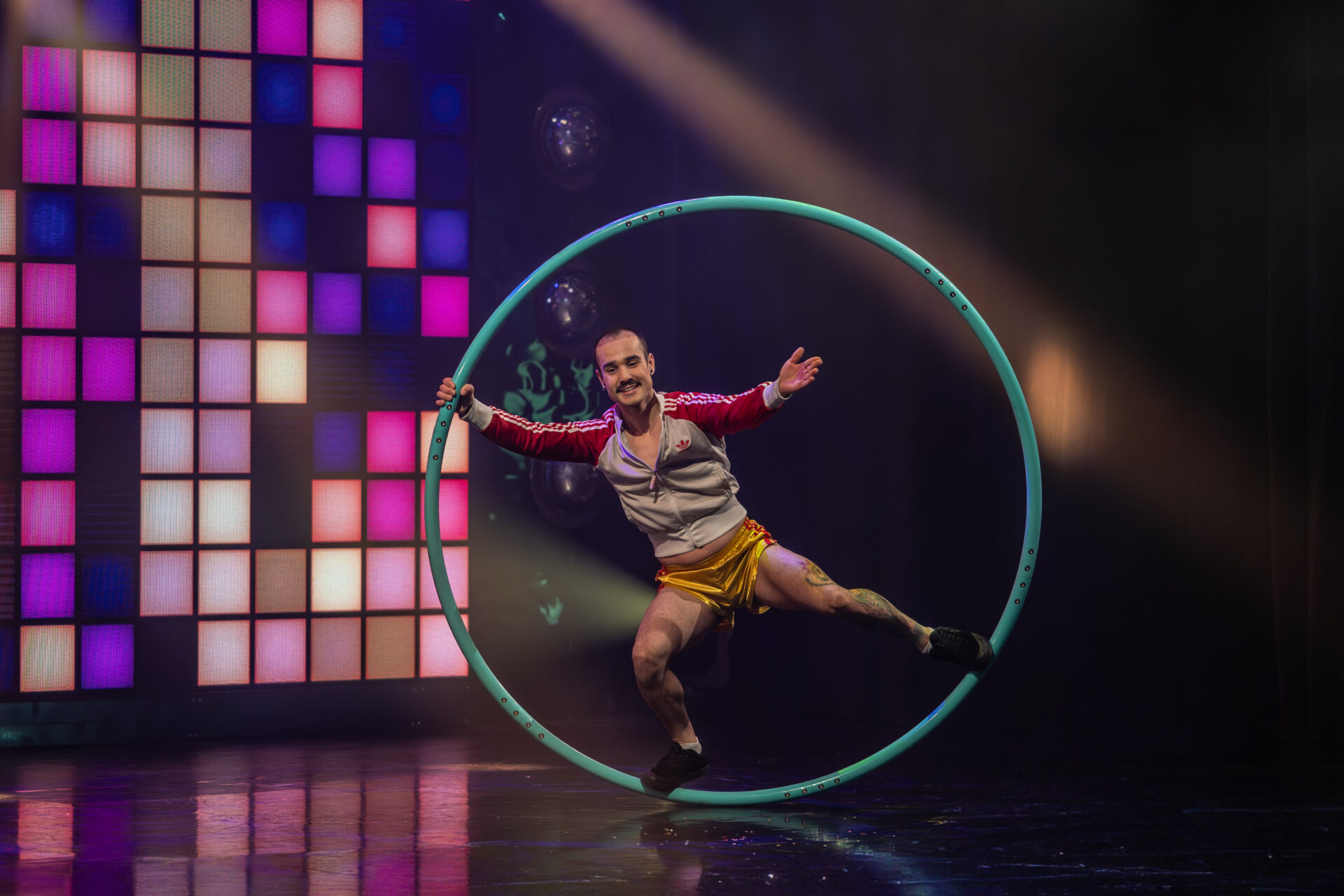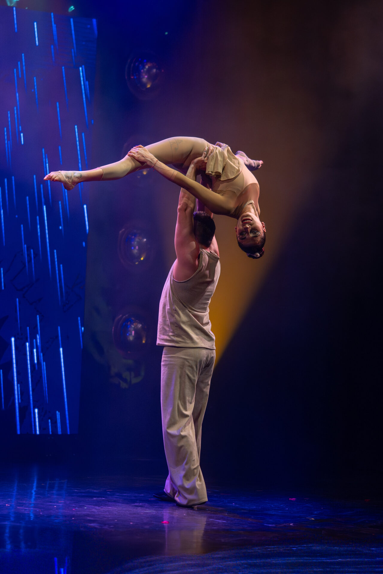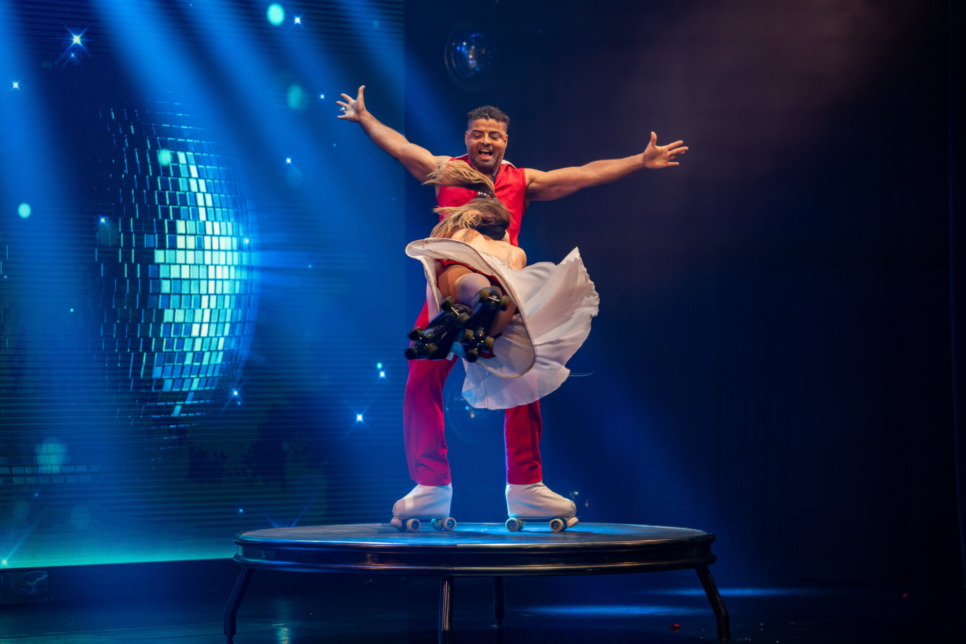 Mit beeindruckender Partnerakrobatik zeigt Duo Oscilante (Nallely Vargas Lima & Emiliano Gallardo Núñez), wie körperliche Kraft, Ästhetik und Gleichgewicht verschmelzen können. Ihre Figuren sind exakt, ihre Momente intensiv – ein starker Kontrast zu den glitzernden Discoelementen der Show.