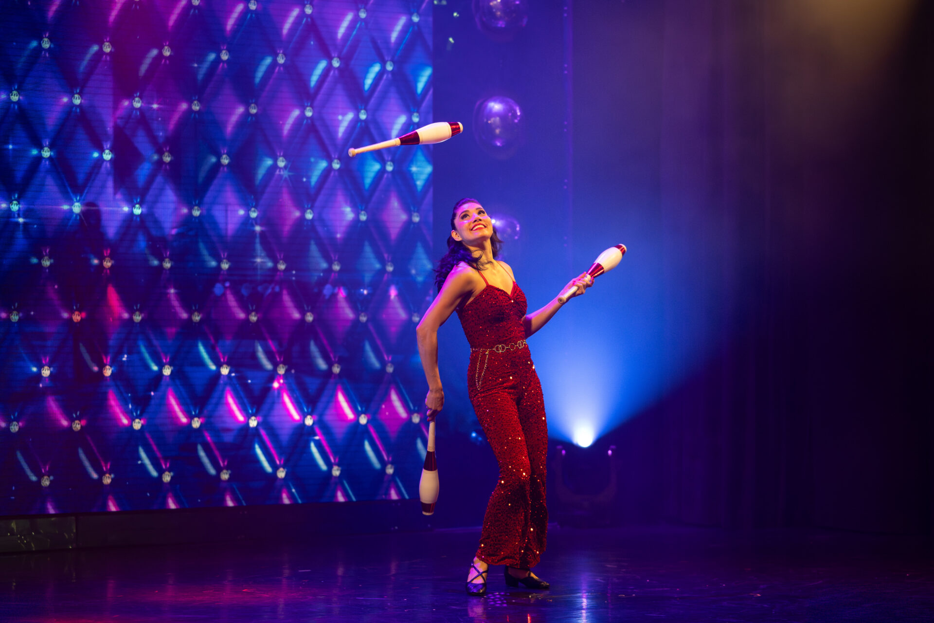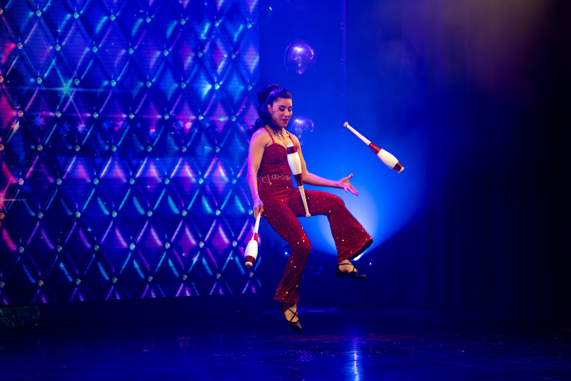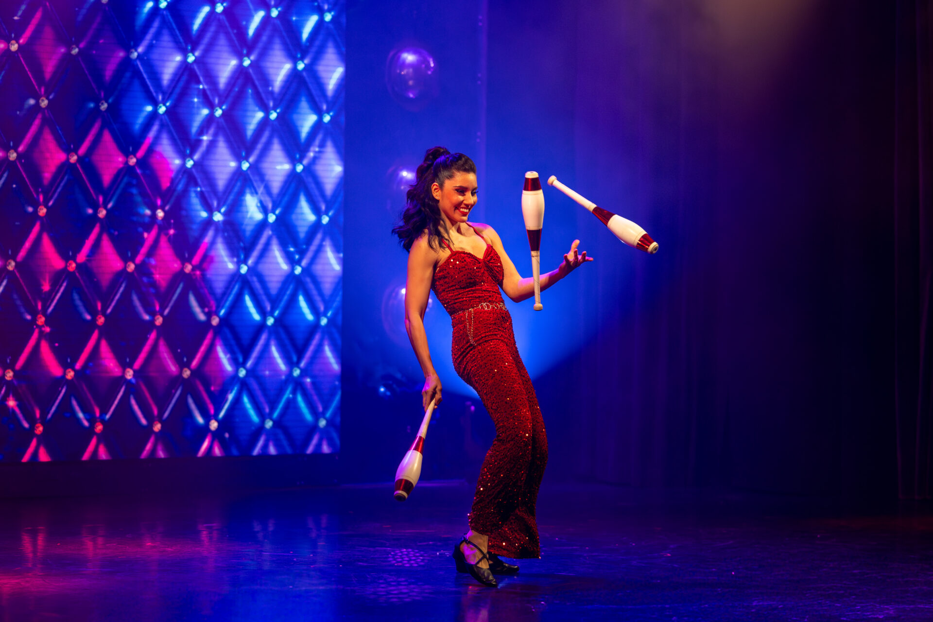 Eröffnet wird der Abend von Jessica Savalla, die mit einer kraftvollen Hula – Hoop – Nummer das Publikum sofort auf Temperatur bringt. Ihr Auftritt ist eine Mischung aus Samba – Temperament, Akrobatik und Show – später tauscht sie Reifen gegen Keulen und kombiniert rasante Jonglage mit einer Prise Rock’n’Roll.