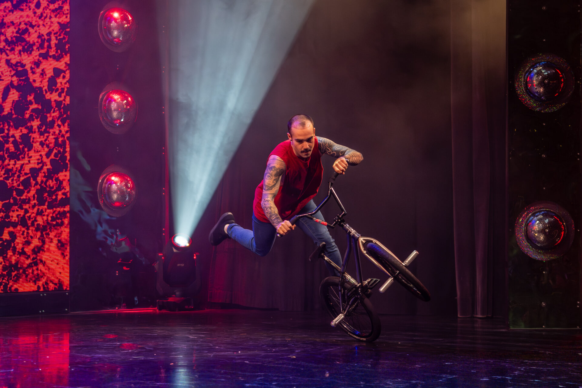 Iñigo Arroyo zeigt, wie spektakulär BMX-Tricks auf einer Varietébühne wirken können: Mit Cyr Wheel, Bike und einer beeindruckenden Körperbeherrschung sorgt er für wow – Momente und Staunen.