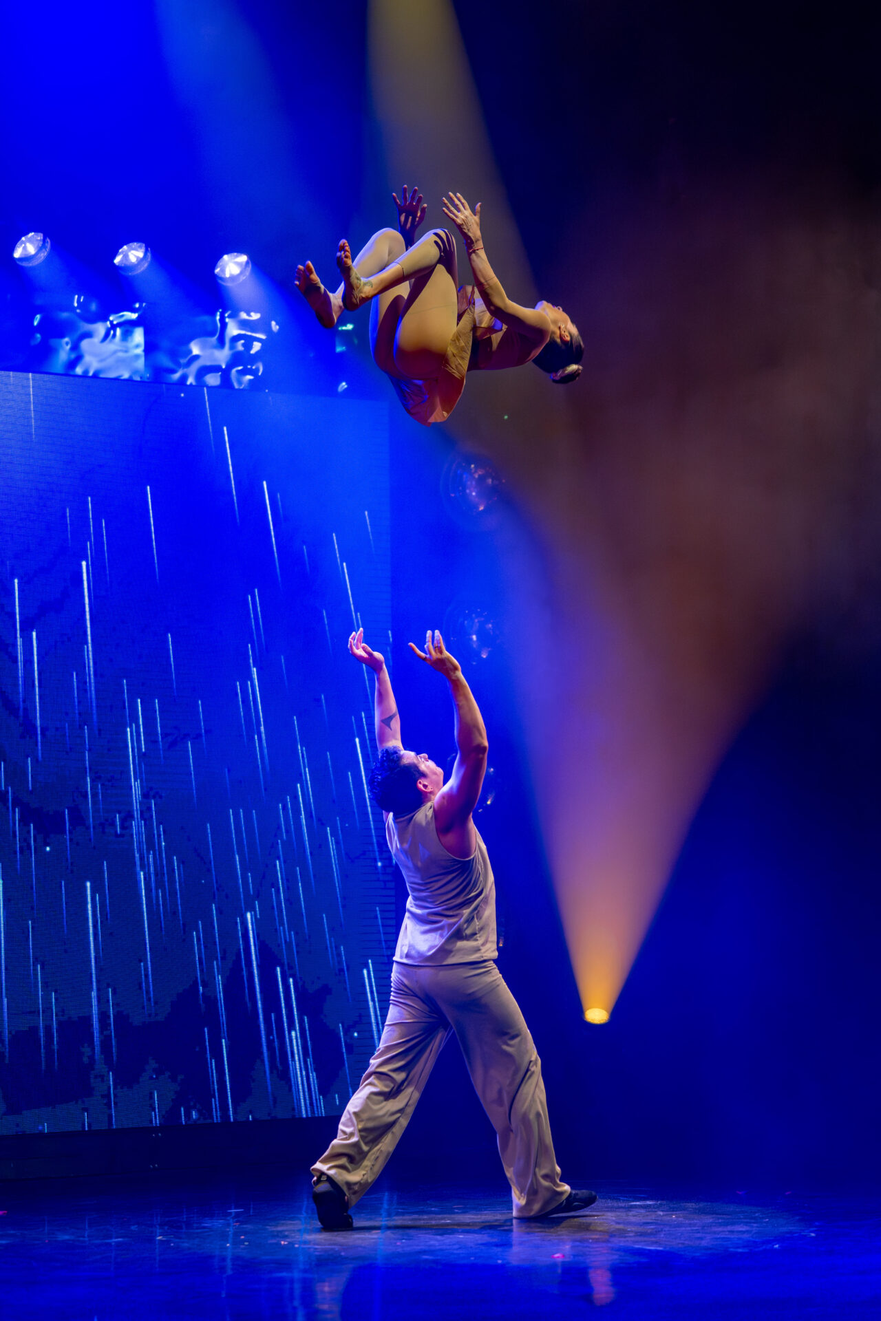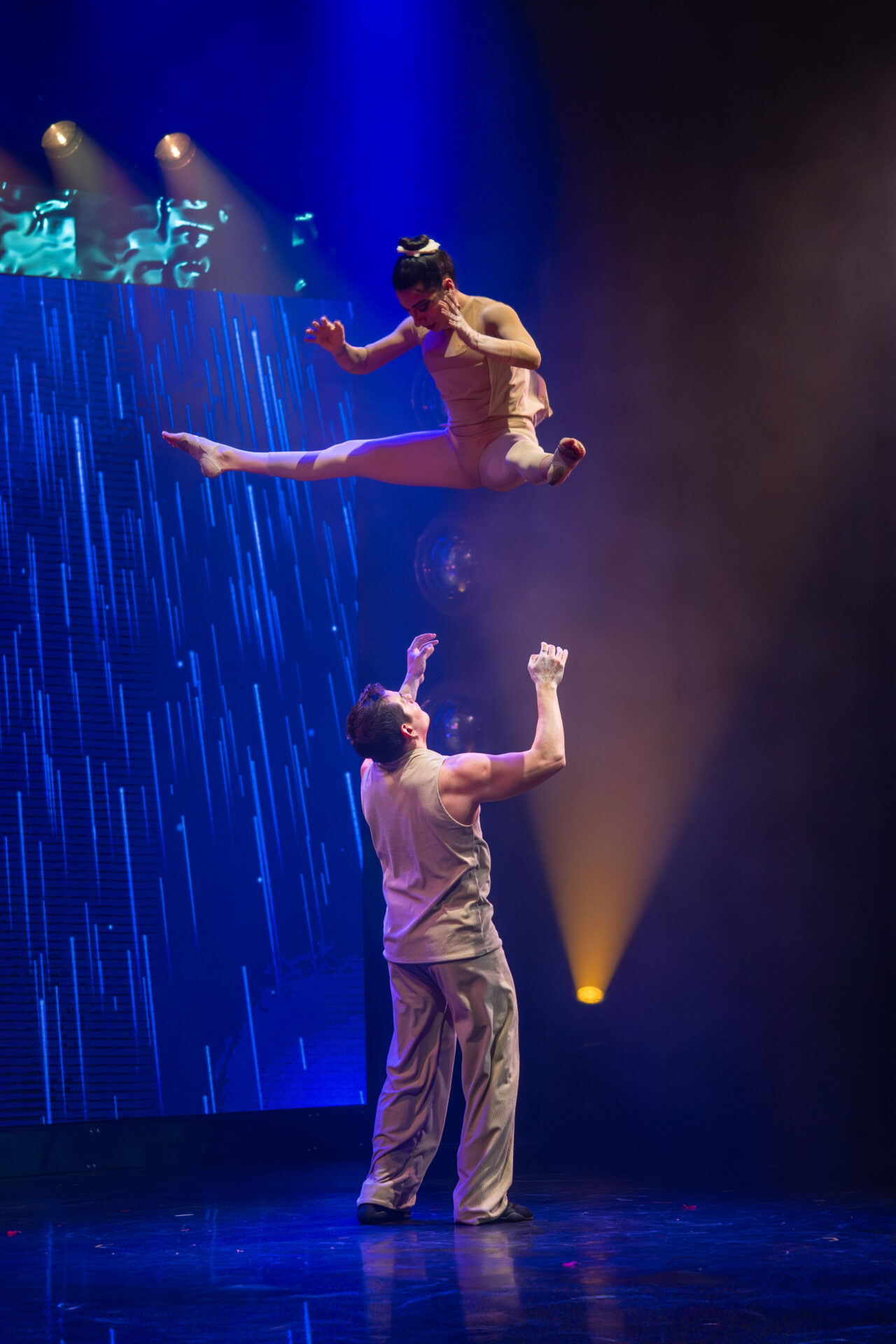 Gleich darauf bringt das Duo Skating Belli (Claudia Costa Leitao & Vinicius Belli) rasante Rollschuh-Artistik ins Spiel. Auf einem winzigen Podest drehen sie sich in irrwitzigem Tempo umeinander, bevor es an den Strapaten tänzerisch und emotional in die Höhe geht.