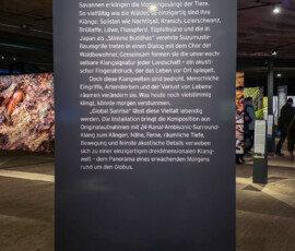 Ebenso beeindruckend: die Installation „Global Sunrise“, die den Moment des Sonnenaufgangs in den Wäldern dieser Welt auf poetische Weise inszeniert. Klang, Licht und Raum verschmelzen hier zu etwas wirklich Magischem.