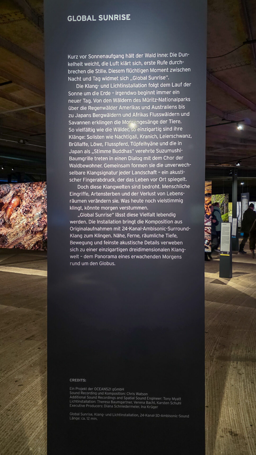 Ebenso beeindruckend: die Installation „Global Sunrise“, die den Moment des Sonnenaufgangs in den Wäldern dieser Welt auf poetische Weise inszeniert. Klang, Licht und Raum verschmelzen hier zu etwas wirklich Magischem.