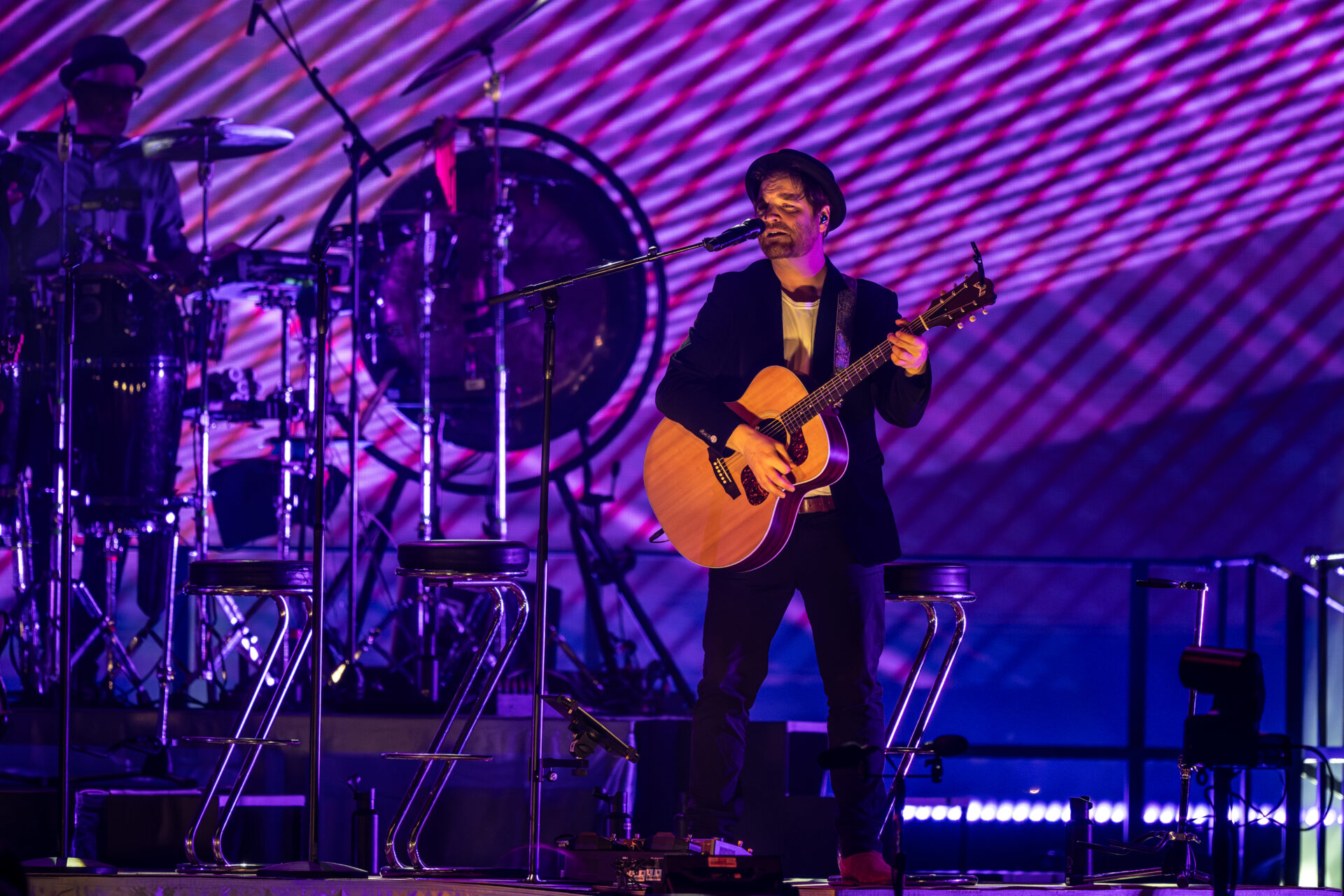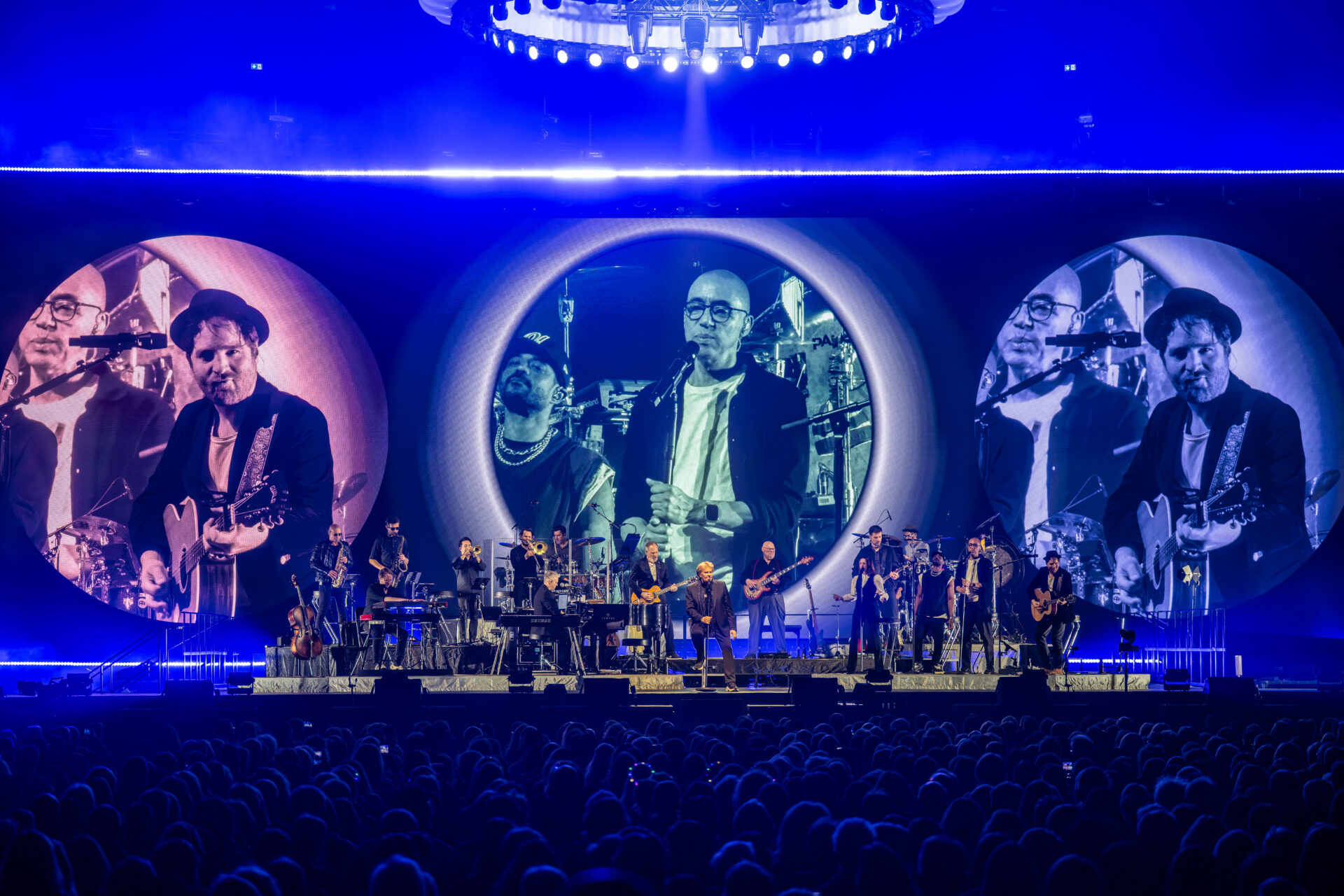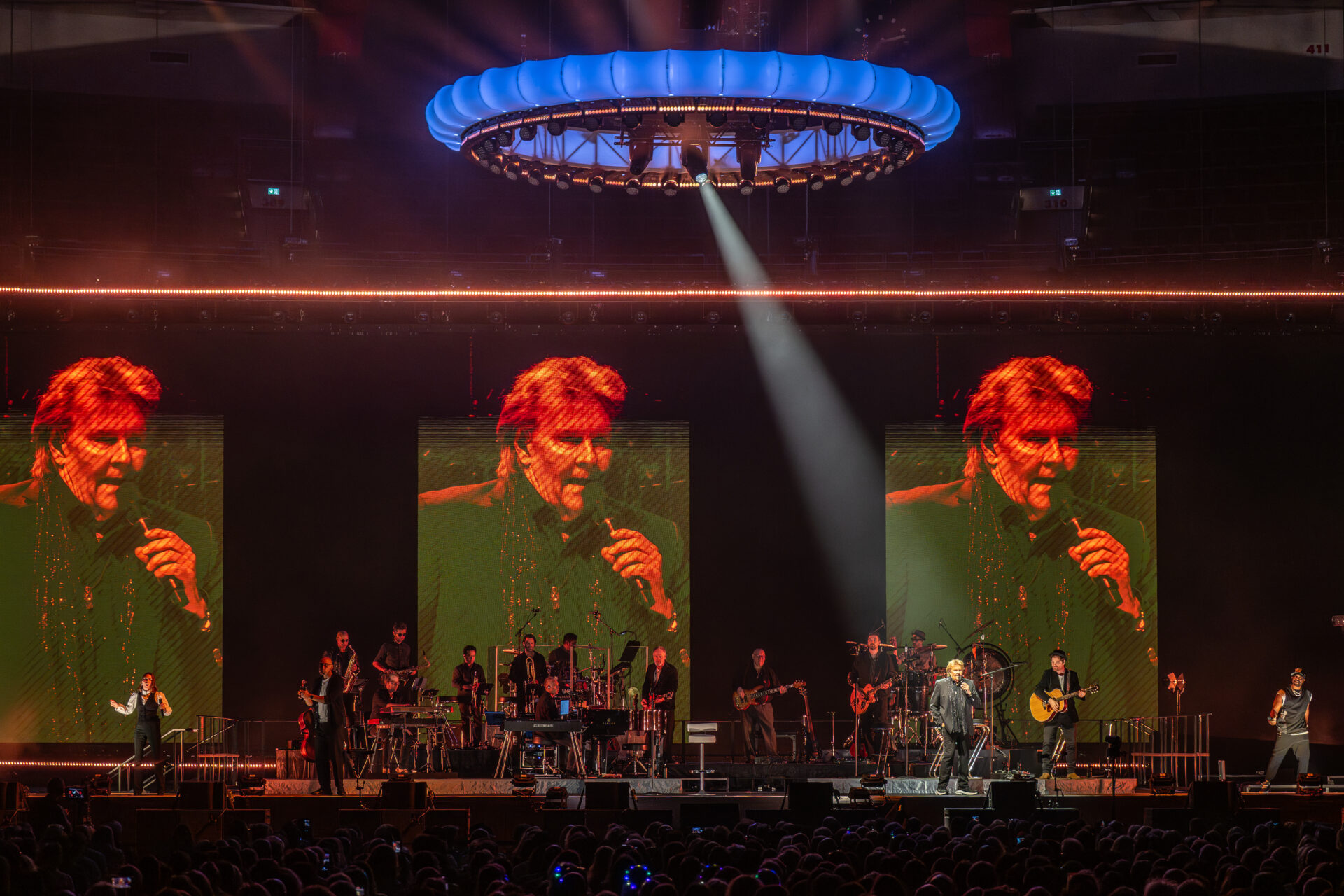Mit „Let’s Do It Again“ startet ein ganz besonderer Abend. Carpendale – ganz in Schwarz, mit Glitzerschal und Sneakers – wirkt zugleich elegant und nahbar. Eine große LED-Wand zeigt Livebilder, das durchdachte Lichtkonzept begleitet das gesamte Konzert: Der Sänger warm und hell im Fokus, die Band in farbiges Licht getaucht – eine Bühne mit beeindruckender Tiefe.